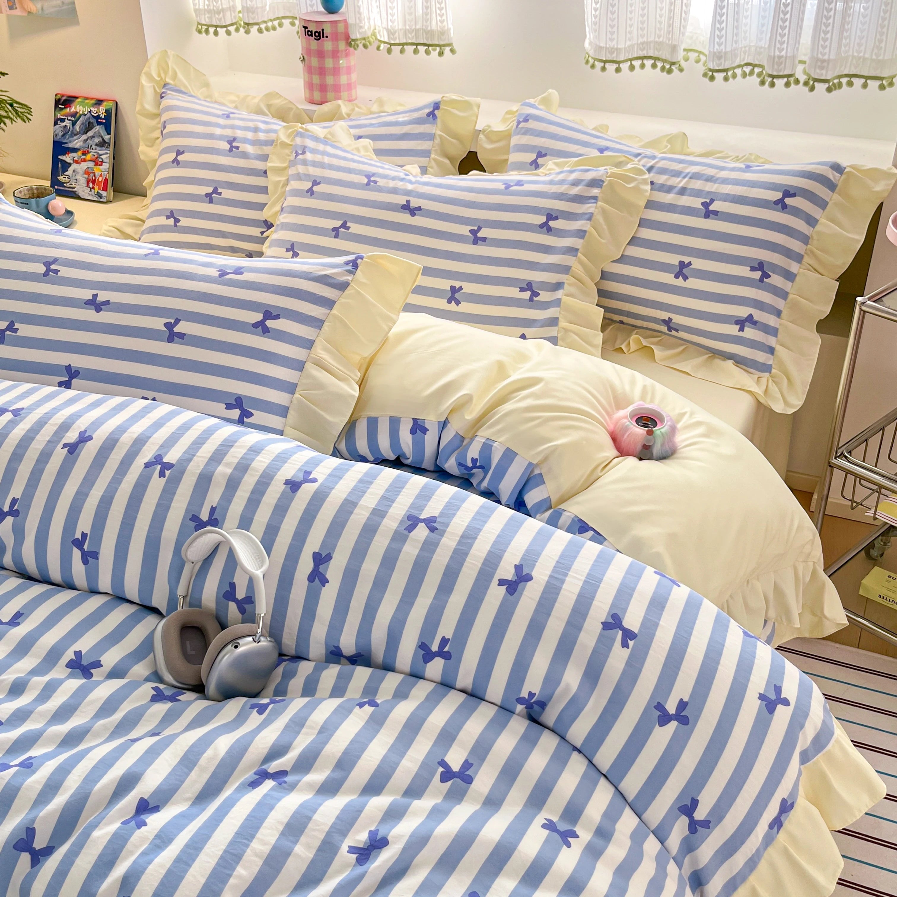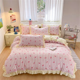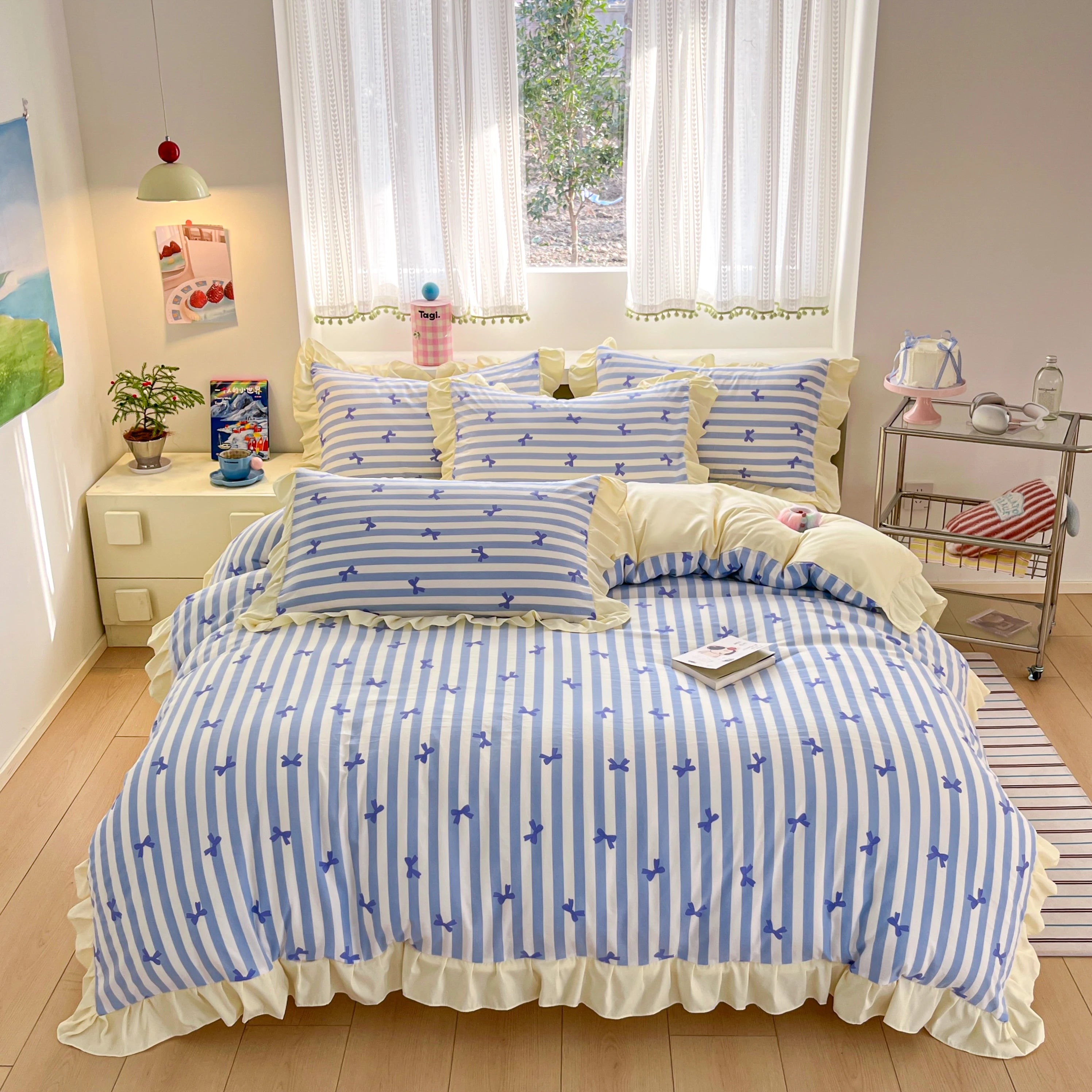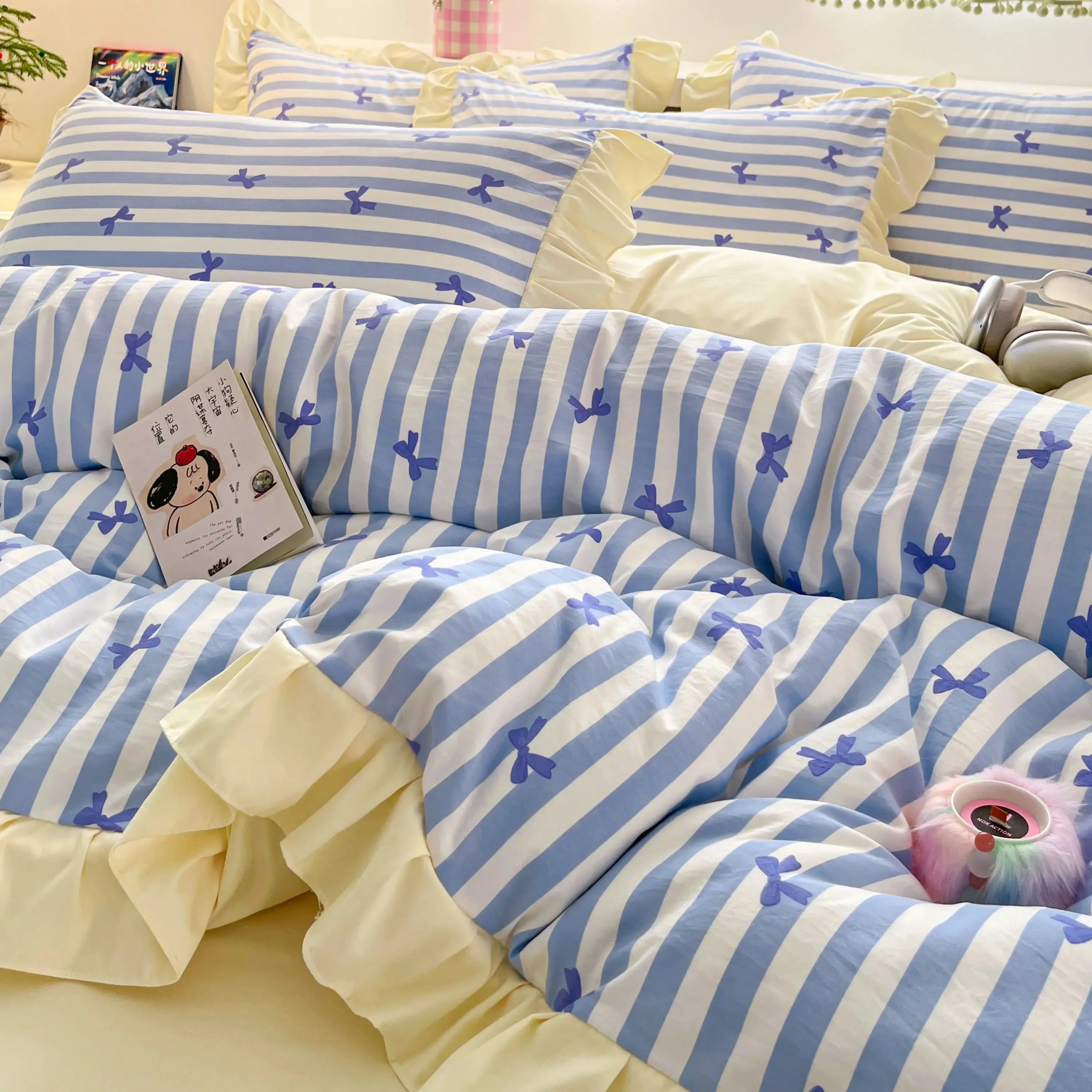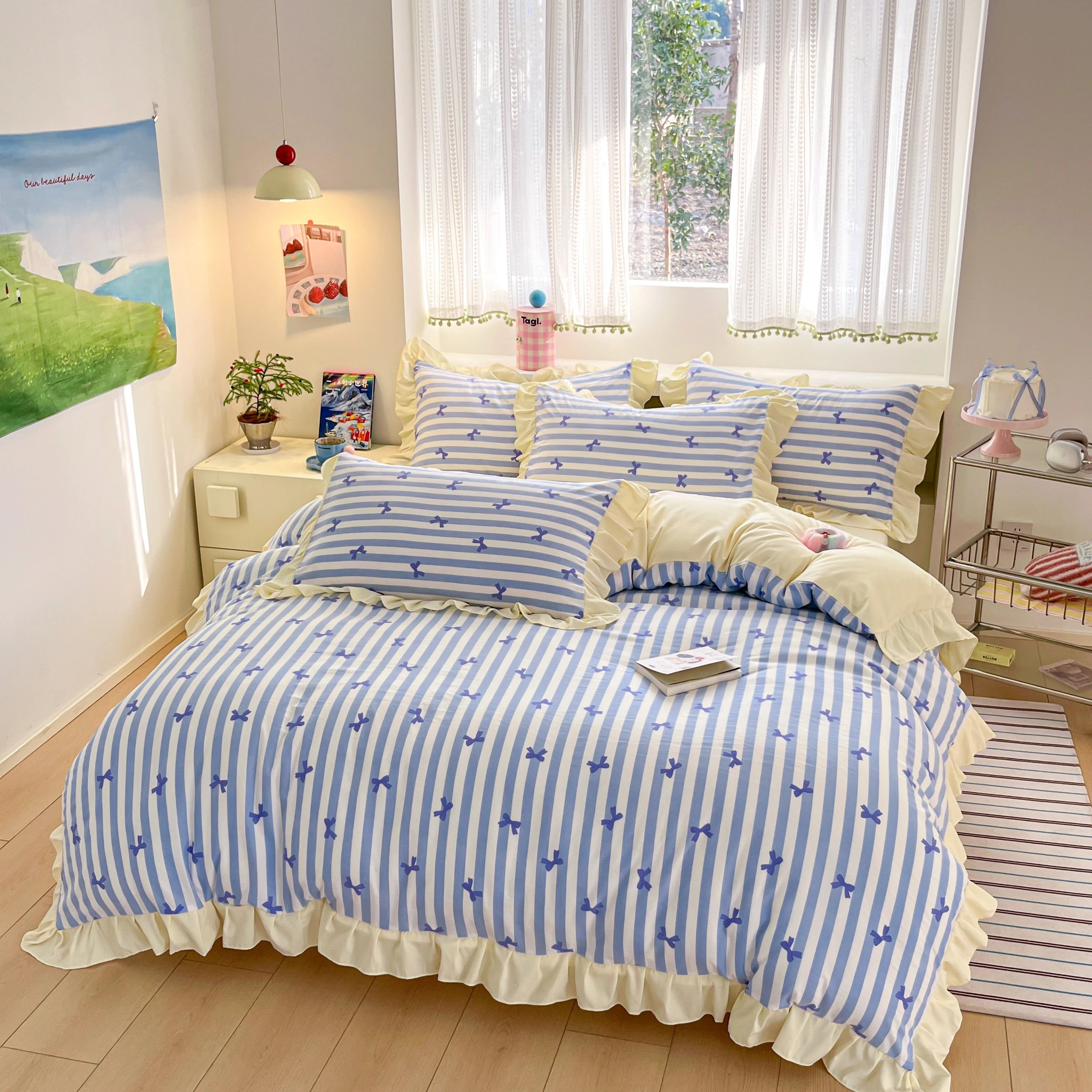 Yeknu Black Lace Ruffles Korean Bow Decor Bedding Set Duvet Cover Pillowcase Washed Cotton Four-Piece Sets Soft Quilt Cover Bed Sheet