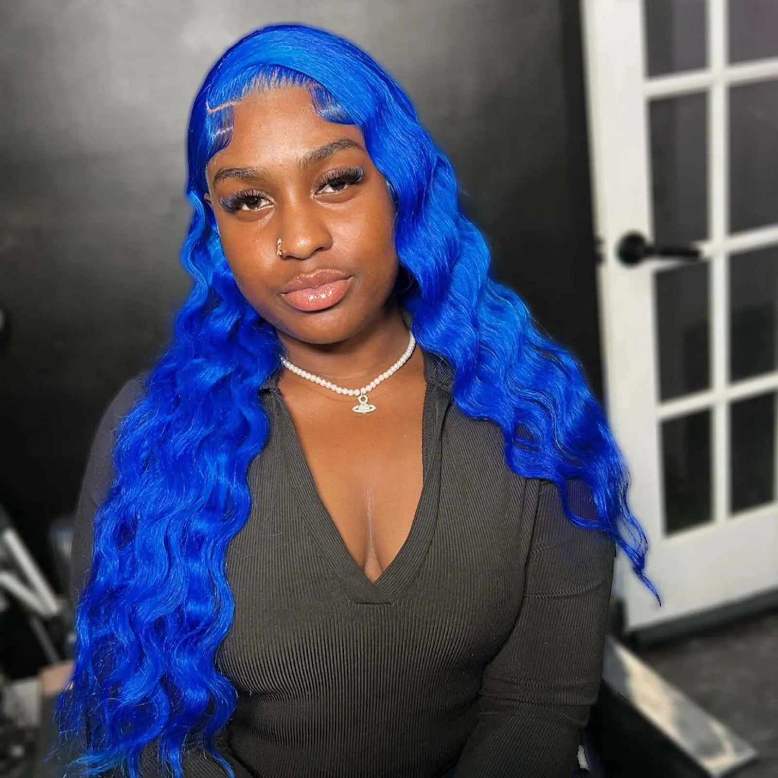 3. This Long Blue Glueless Frontal Wigs has Deep Parting Space on A Soft Invisible Lace Front, Giving You a Free Choice of Parting. Circumference 22.5 Inches Stretched Medium Cap (Average Cap Size) with Adjustable Straps and 3 Combs.