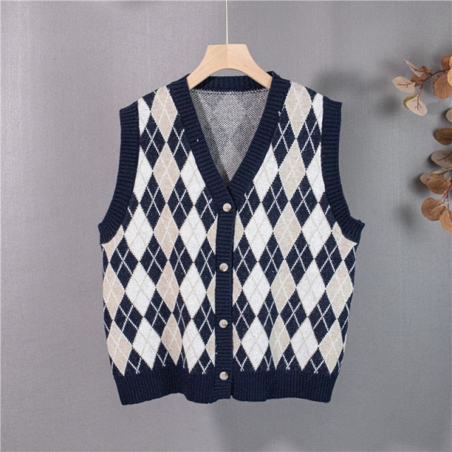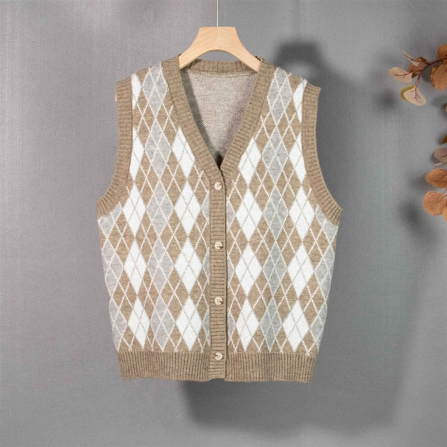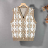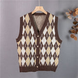 Yeknu Colorfaith New Autumn Winter Women Sweaters V-Neck Sleeveless Oversized Retro Vest Checkered Waistcoat Lady Tops SWV1388JX