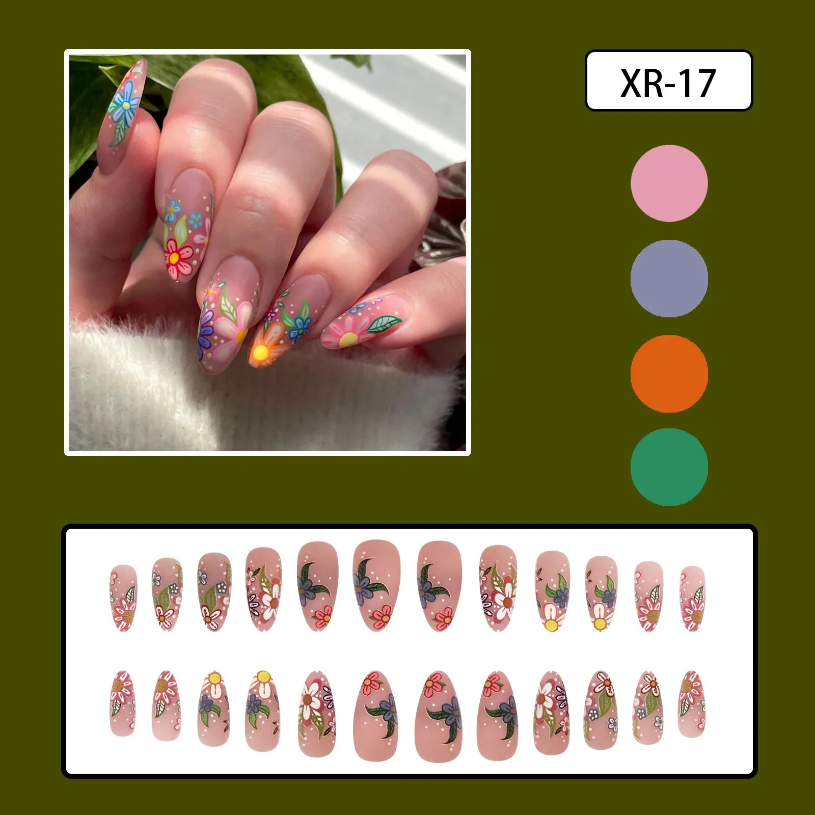 Yeknu  Colorful Flowers Fake Nail Acrylic Long Flower Pattern False Nails Full Cover Wearable Sweet Korean Glossy Press on Nails Tips