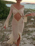 Yeknu Deep V Neck Sheer Dress For Women Elegant Slim Hollow Out Dress Femme Holiday Beach Sexy Ruffle Slit Evening Dress Ladies