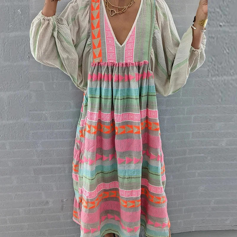 Yeknu Fashion Women Geometric Print Party Dress Sexy V Neck Patchwork Cotton Linen Dress Vintage Spring Puff Long Sleeve Maxi Dresses
