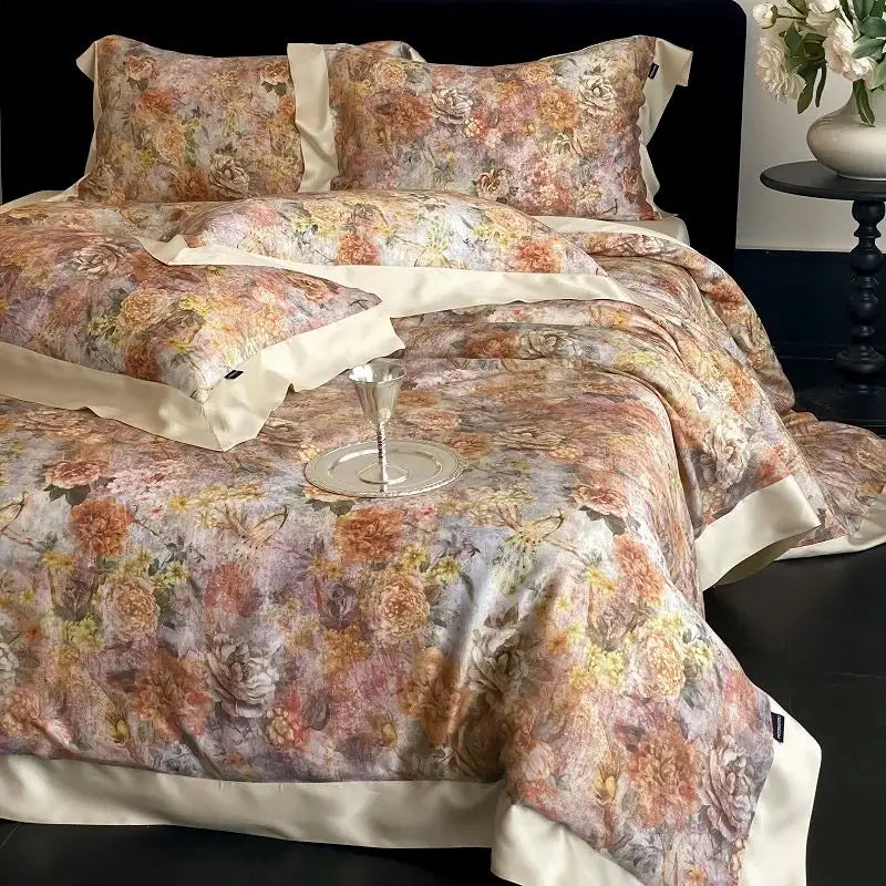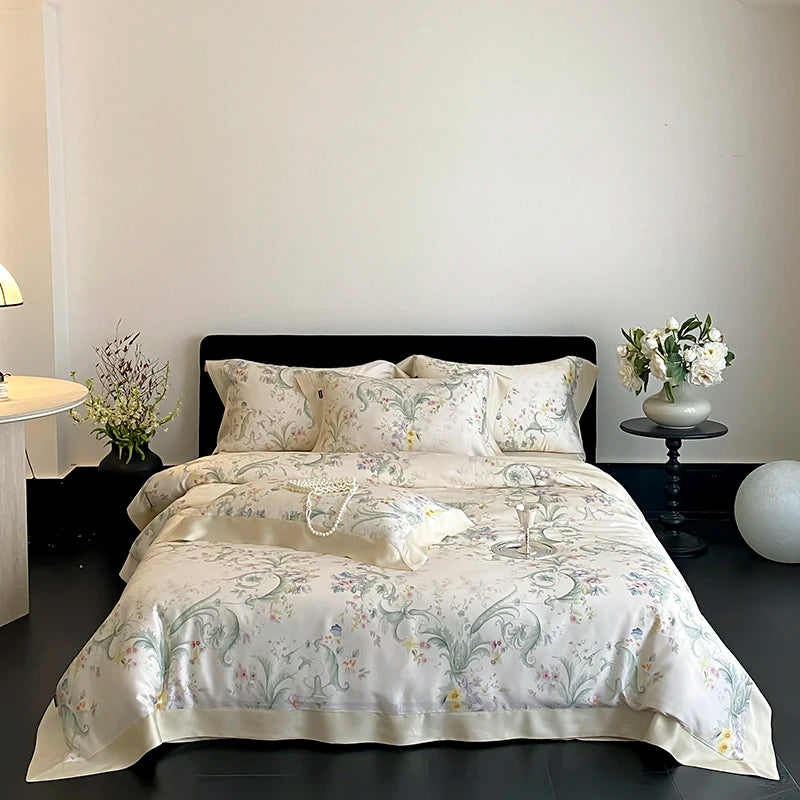 Yeknu Flower Prints Luxury Bedding Set Lyocell Soft Silky Cool Feeling Antimicrobial Duvet Cover Flat/Fitted Bed Sheet Pillowcase 4Pcs