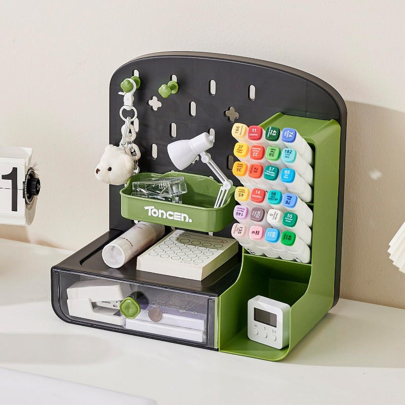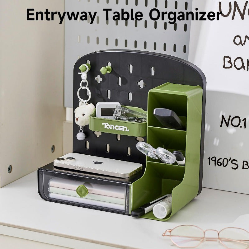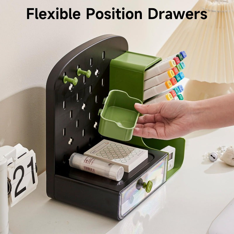 Compact and Functional Design: This desktop organizer measures 9.96" x 5.98" x 10", making it the perfect size for any desk, vanity, or office space. The sleek design features a drawer for small items and multiple compartments for organizing pens, makeup, or office supplies. Customizable and Expandable Design: The office desk organizer includes a customizable pegboard back panel, allowing you to hang additional accessories like keychains, small lights, or other desk essentials. Thi