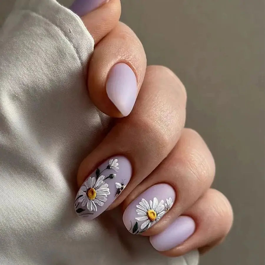Yeknu Hand-painted Daisy Flowers Bee Nail Art Purple Color False Nails Fashion Detachable Finished Fake Nails Press on Nails with Glue
