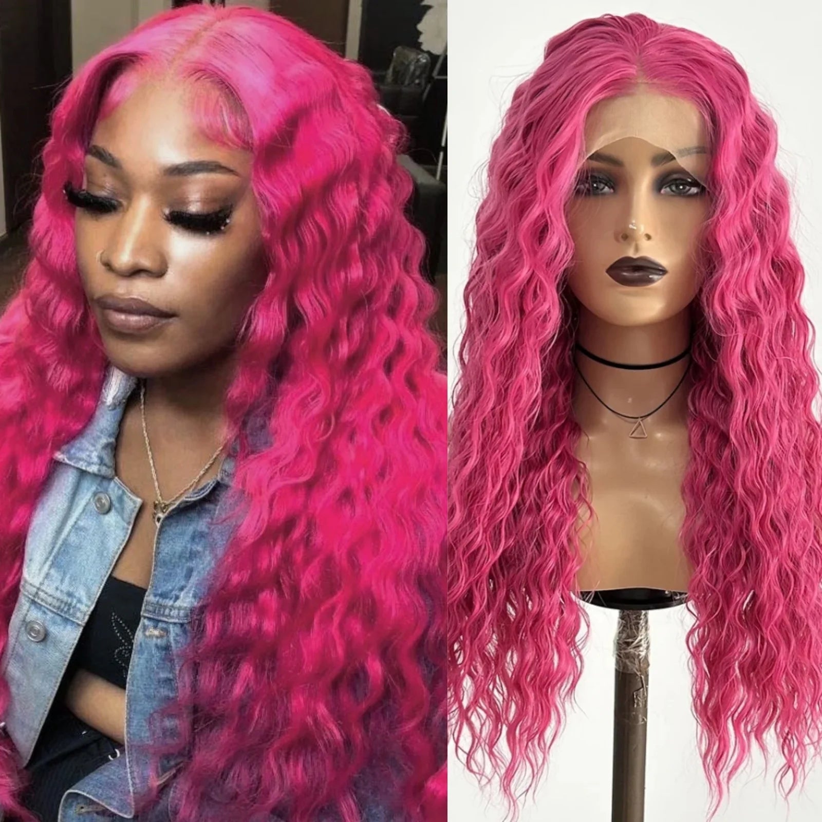 Yeknu Hot Pink Wig Deep Wave Synthetic Lace Front Wig Glueless Natural Hairline Rose Red Long Curly Hair Lace Frontal Wigs for Women