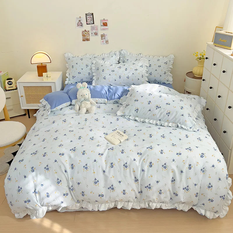Yeknu Ins Style Floral Duvet Cover Set Flat Sheet Pillowcases No Filling Queen 200x230cm Romantic Girls Blue Bedding Flower Bed Linens
