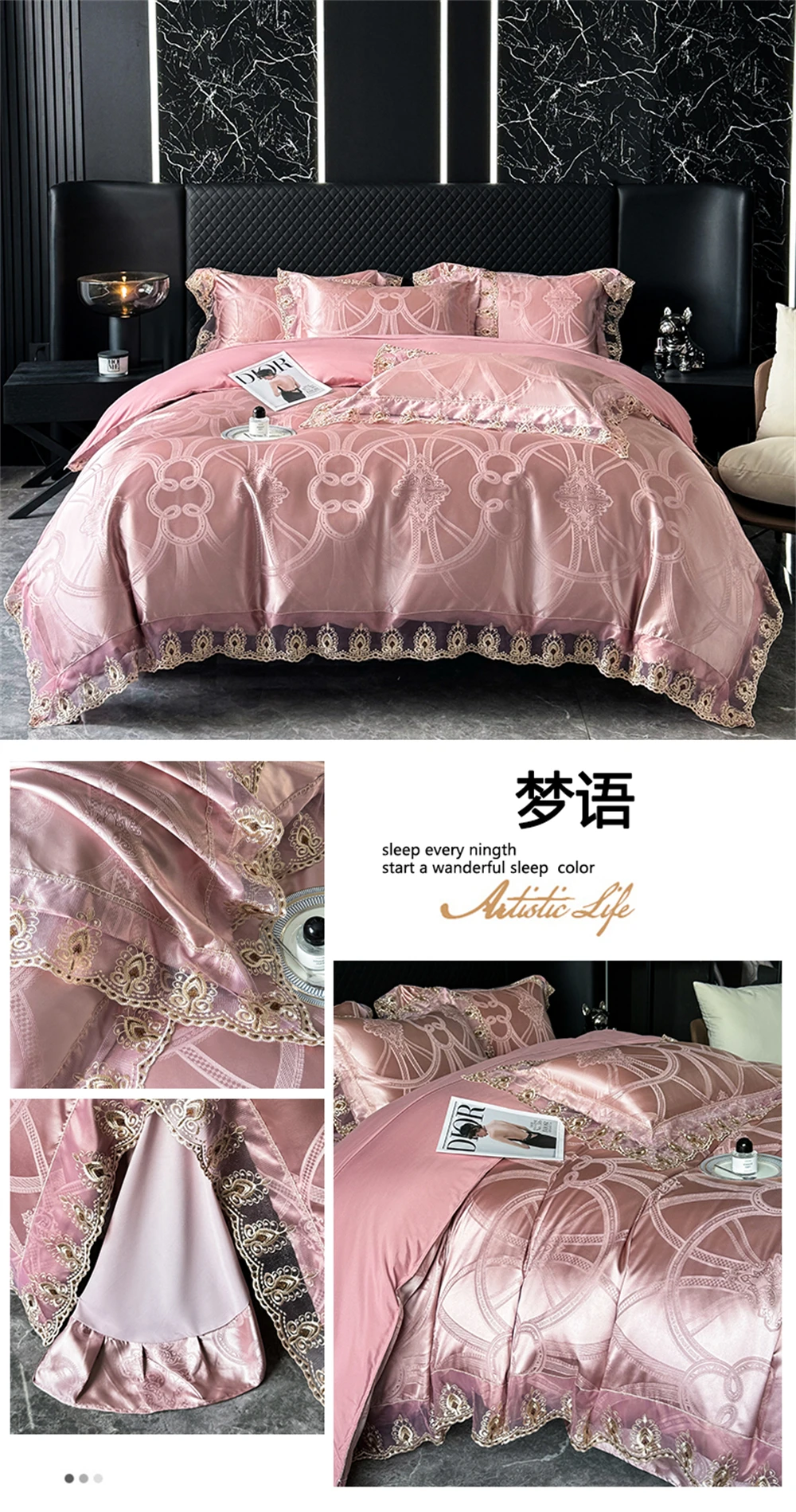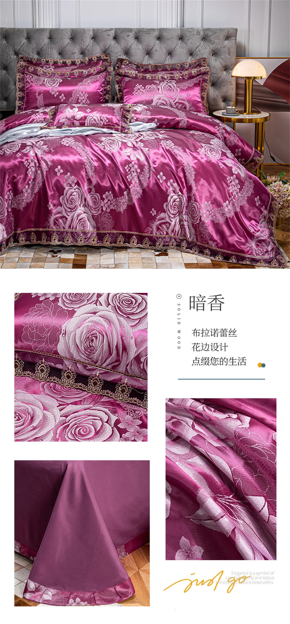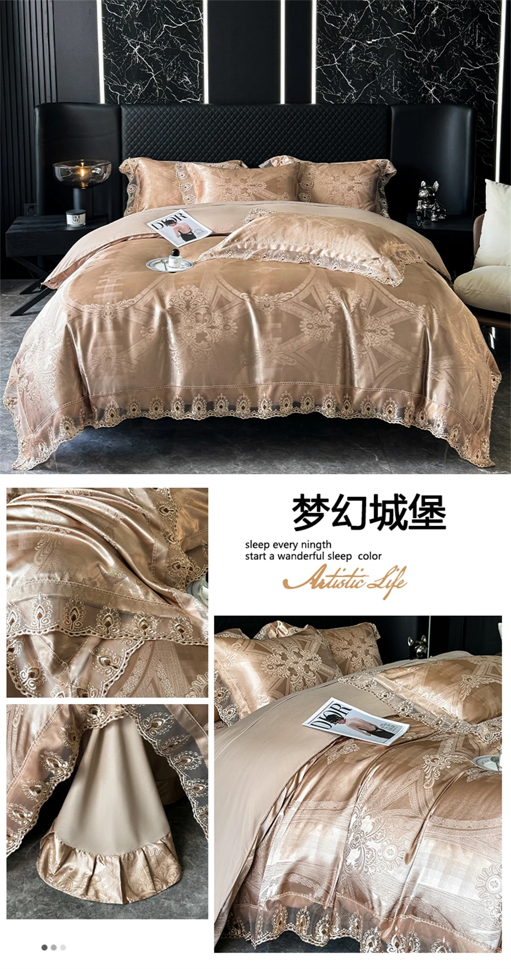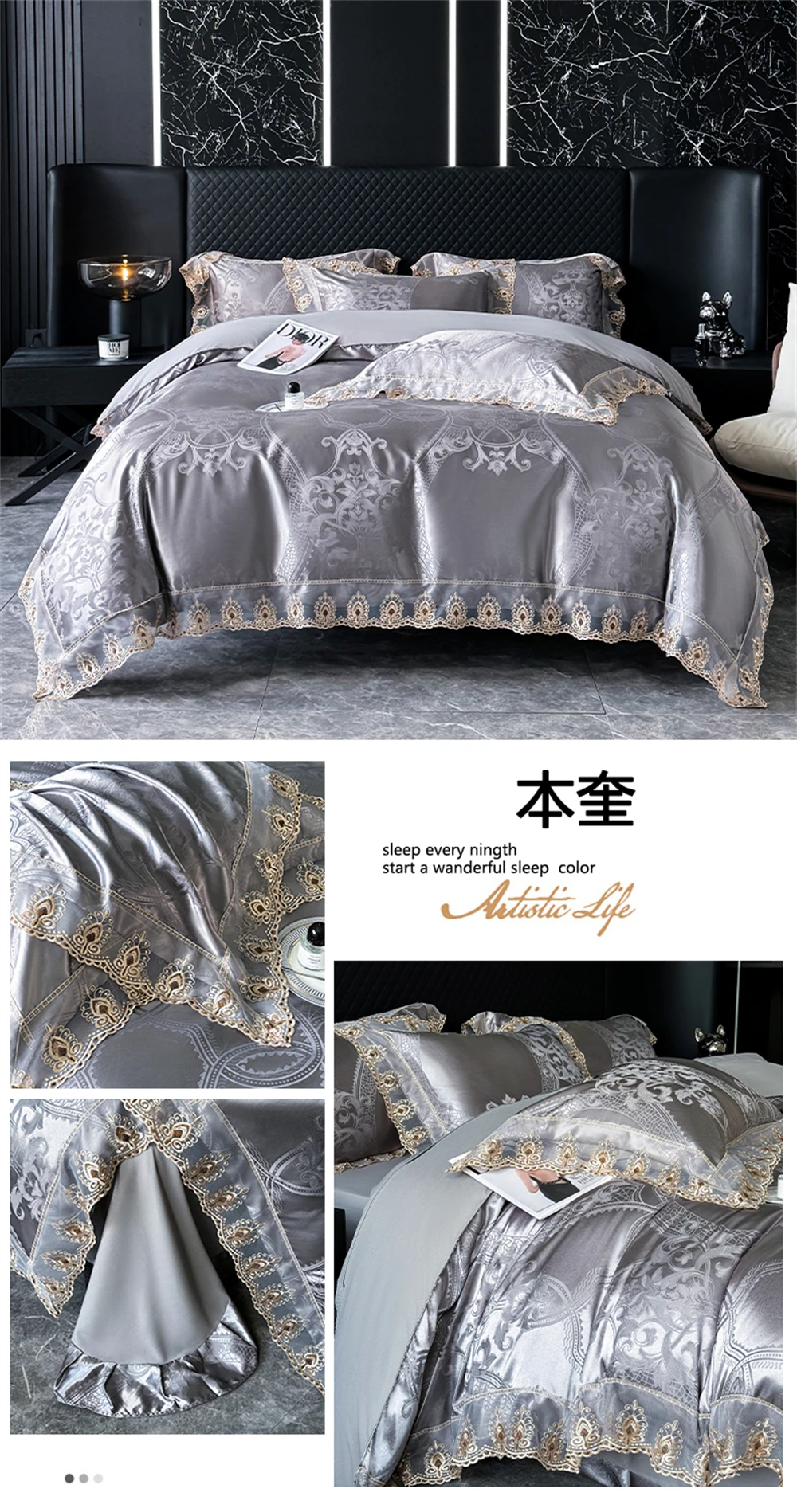 Yeknu Jacquard Weave Sateen Lace Natural Comforter Bedding Set Satin Soft Luxury Four Pieces Set Home Duvet Cover Bed Sheet Pillowcase