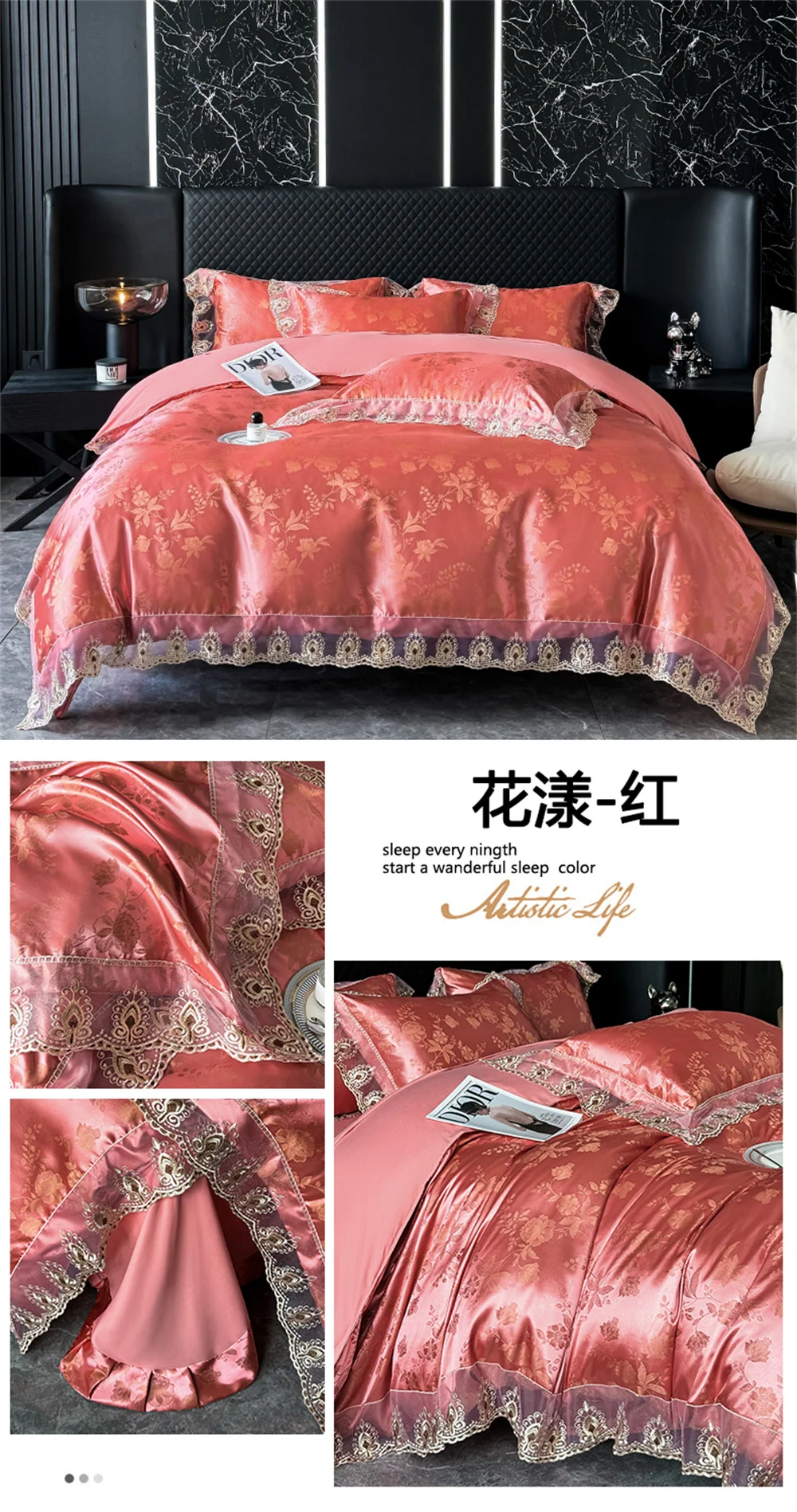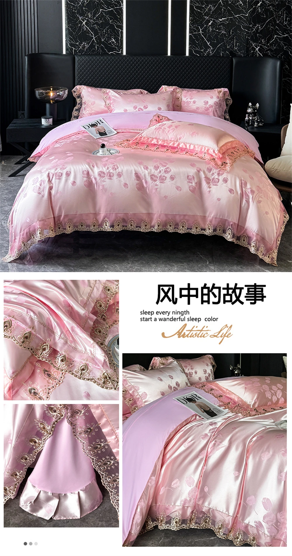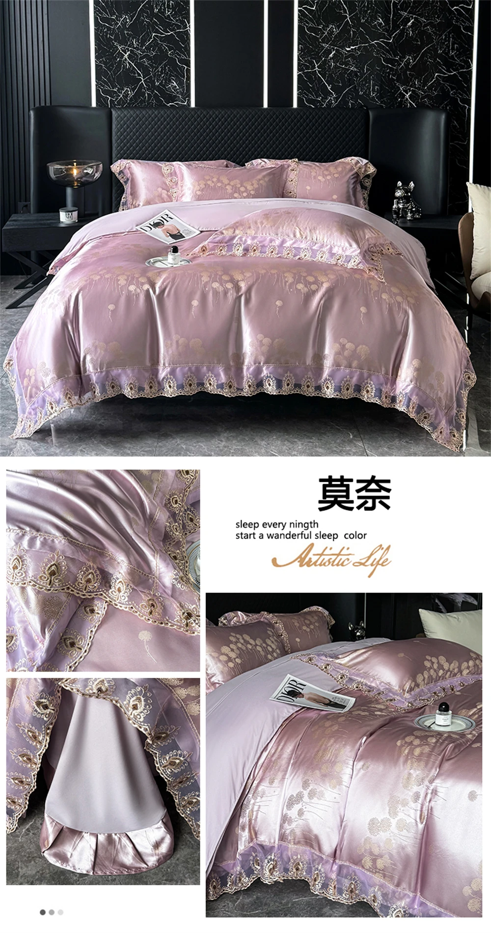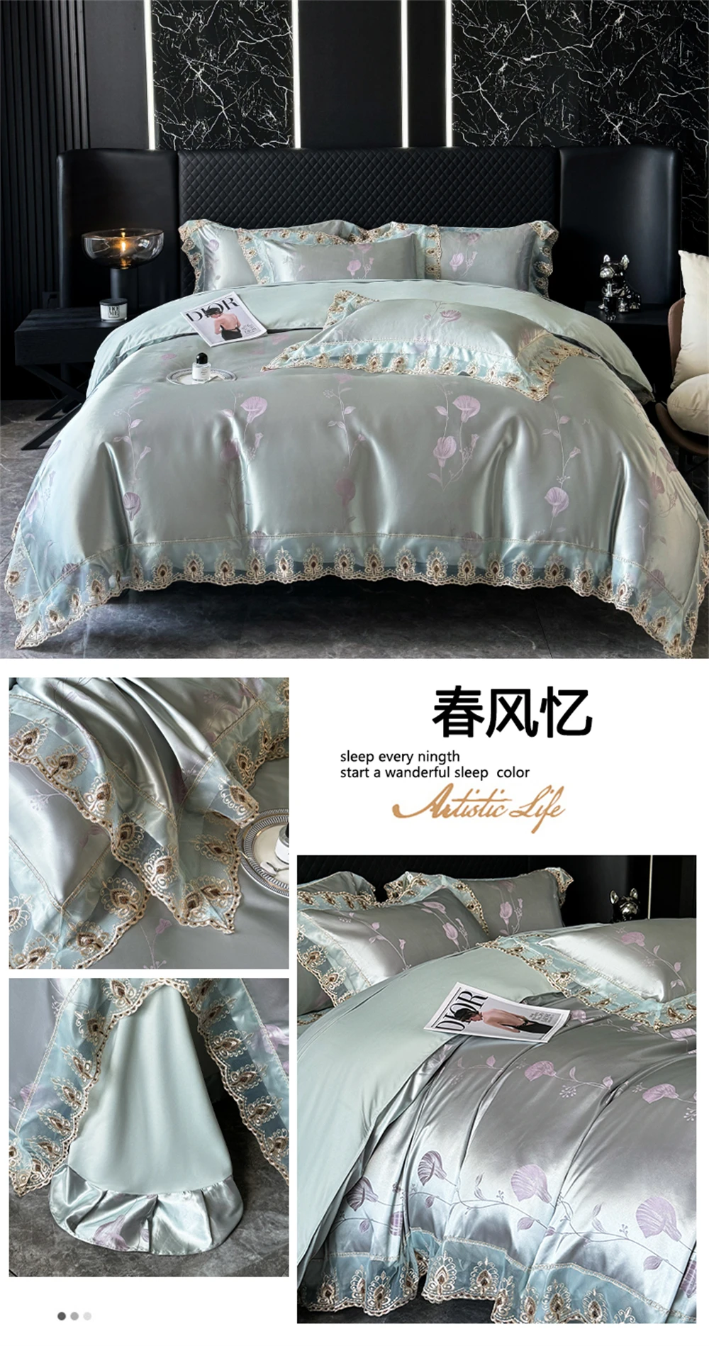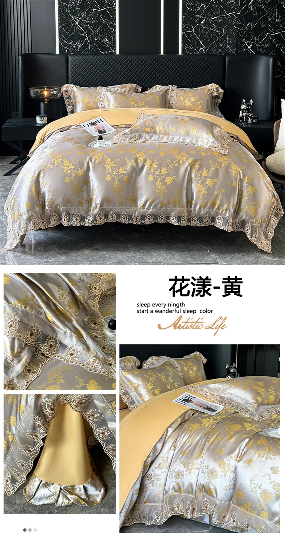 Yeknu Jacquard Weave Sateen Lace Natural Comforter Bedding Set Satin Soft Luxury Four Pieces Set Home Duvet Cover Bed Sheet Pillowcase