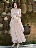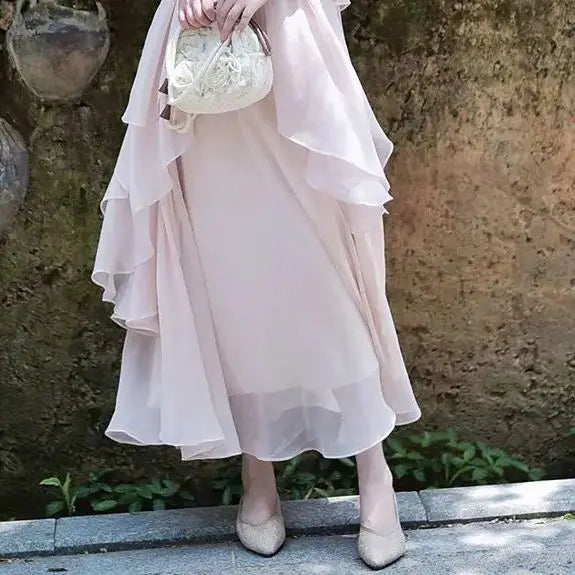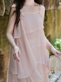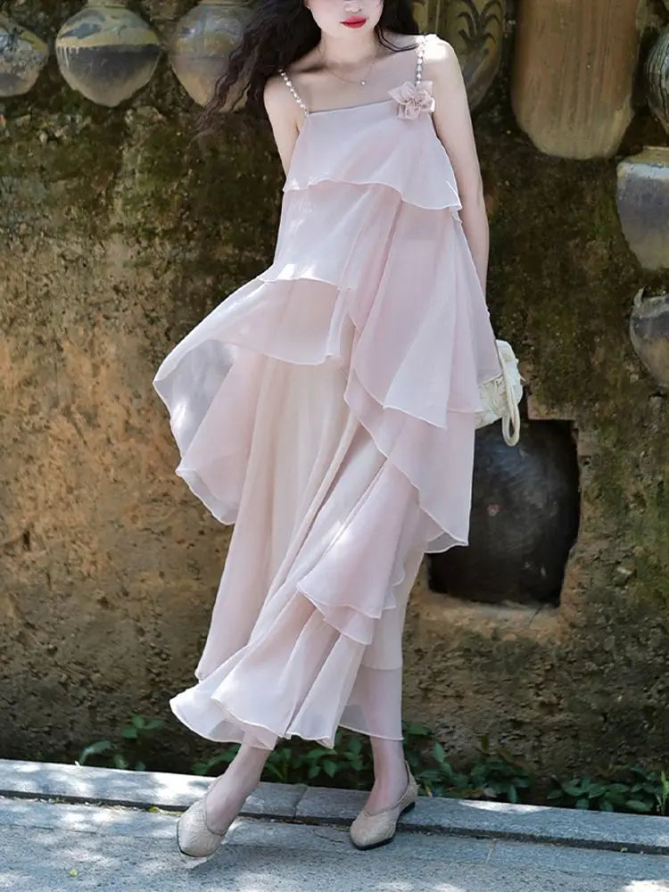 Yeknu Korea Summer Outfits Fairy Suit For Women'S Pink Sweet Pearl Strap Chic Top Chiffon Skirt Elegant Two Piece Set