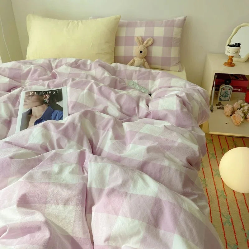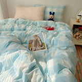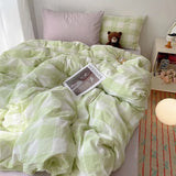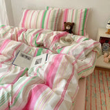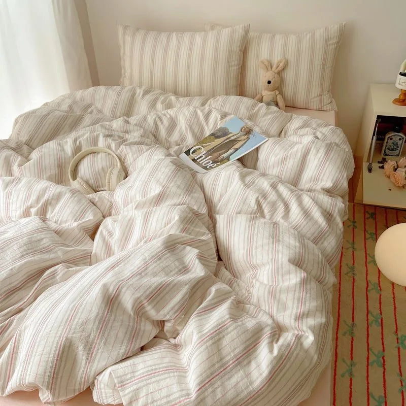 Yeknu Korean Bedding Set INS Girls Striped Soft Washed Cotton Bed Sheet Set Queen King Size Comforter Set Pillowcase Bed Linens