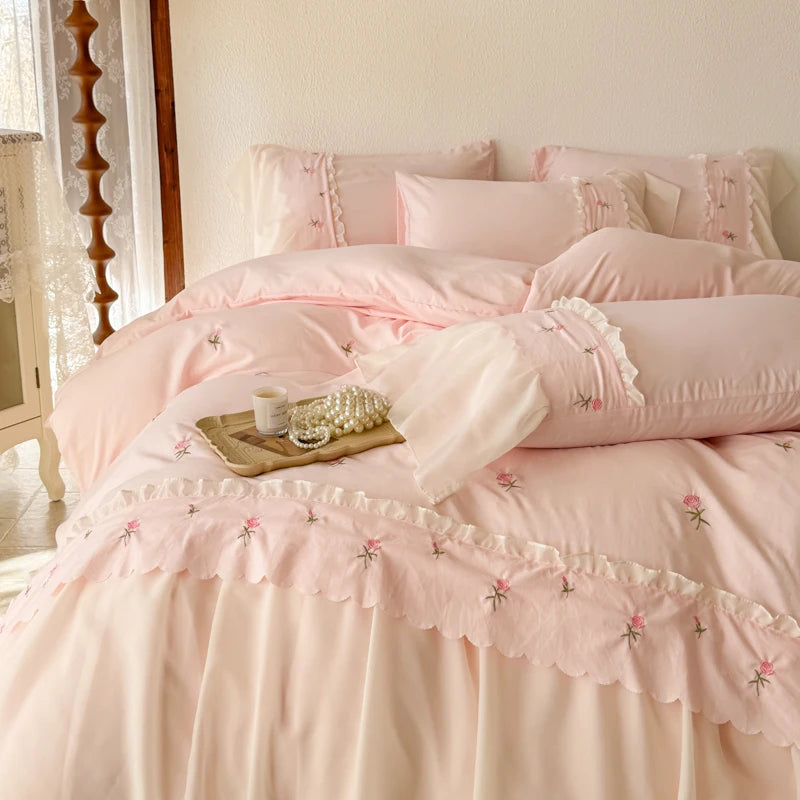 Yeknu Korean Princess Style Lace Ruffles Rose Embroidery Wedding Bedding Set Duvet Cover Set Flat/Fitted Bed Sheet Pillowcases 4Pcs