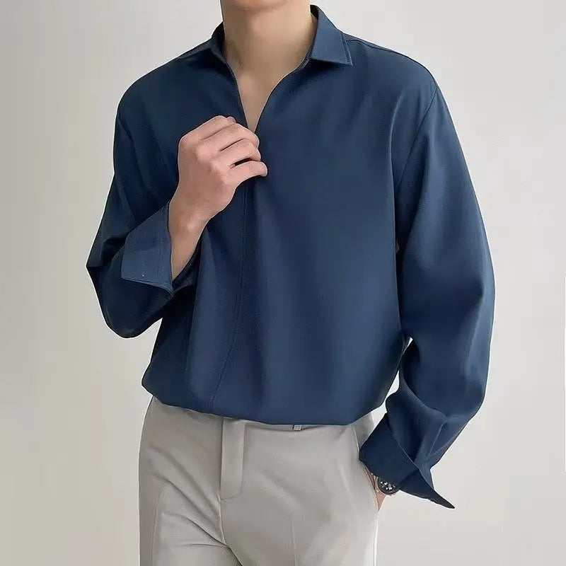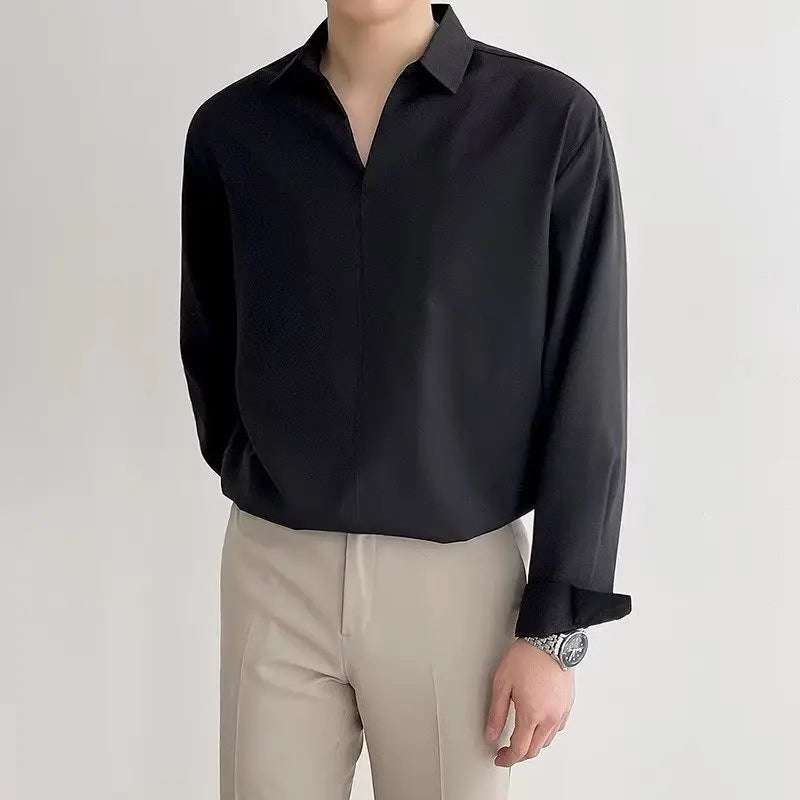 Yeknu Long Sleeve New Thin Drape Casual Shirt for Men Small V-neck Design Men Shirt Summer Loose Korean Solid Color White Shirt Men