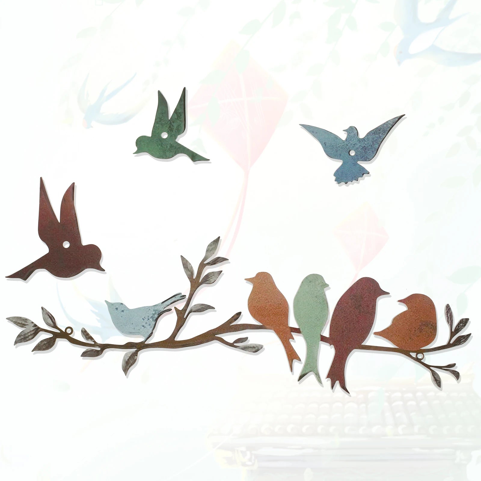 This metal decoration is designed as a branch with leaves, five birds are standing on the branch, three birds are flying high, lifelike and very cute. It looks artistic and elegant.