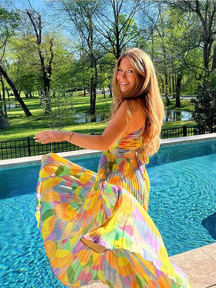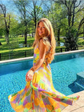 Yeknu Multi Color Printed Splicing Pleated Long Dress For Woman Sexy Sleeveless Backless Female Maxi Dresses Holidays Party Robes