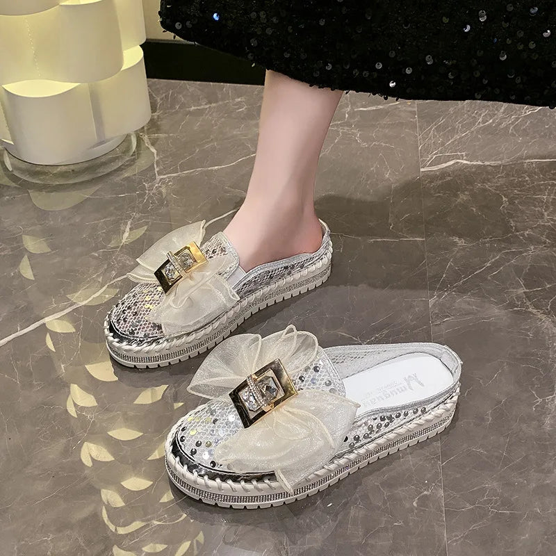 Yeknu New Crystals Butterfly-knot Flat Platform Heels Summer Half Slippers Women Bling Shoes Breathable Mesh Slides size 35-40