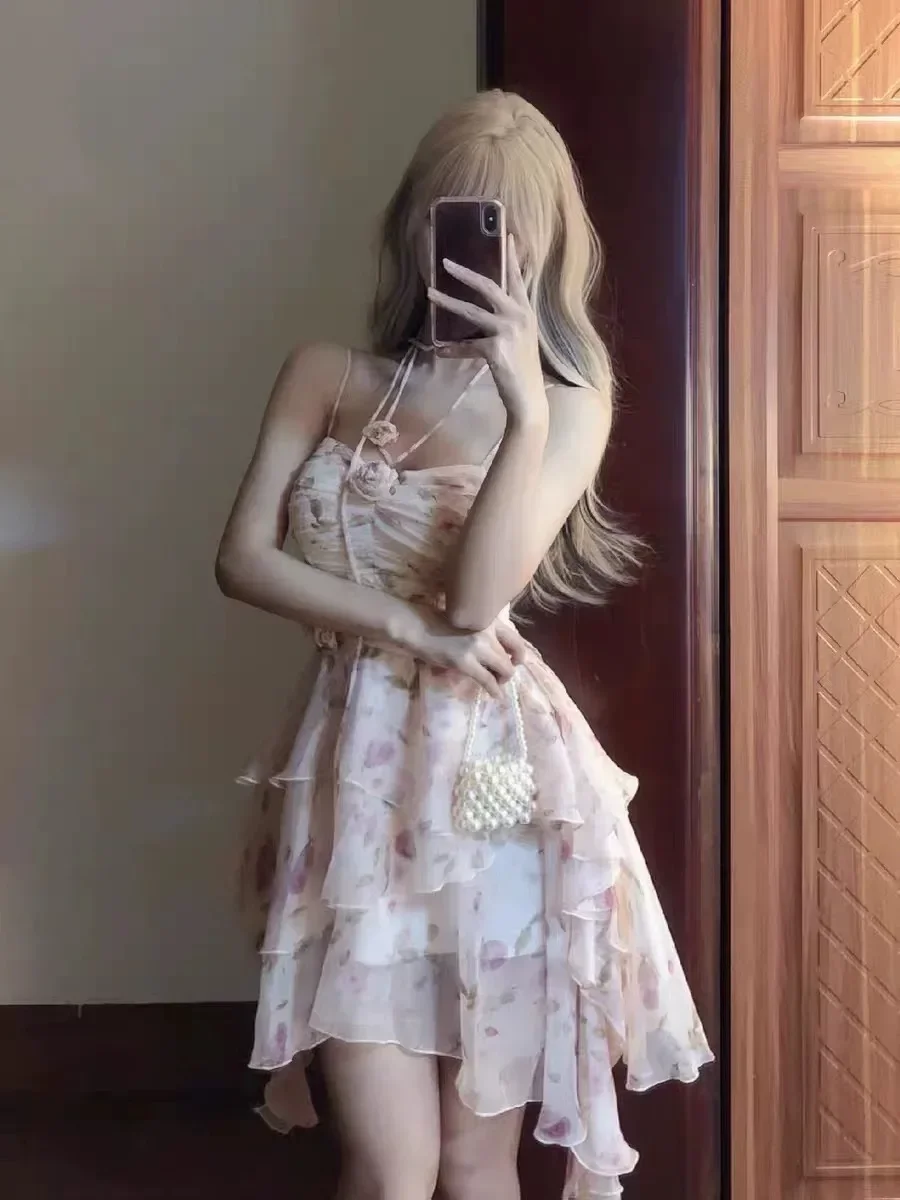 Yeknu New Sweet Oil Painting Strap Fragmented Flower Slip Dress Summer Retro Irregular Waist Slim A-line Mid Length Dress for Women