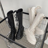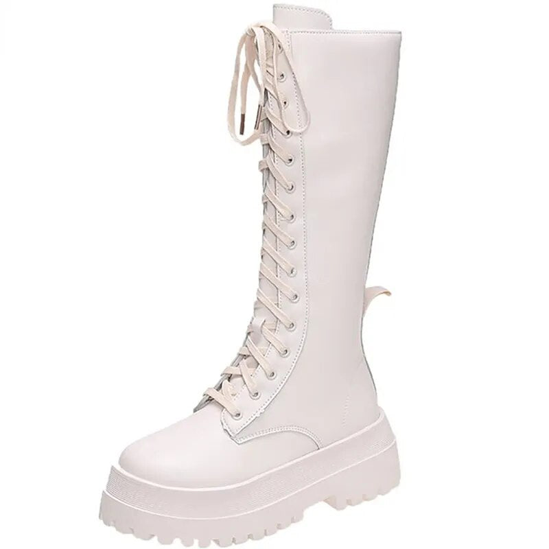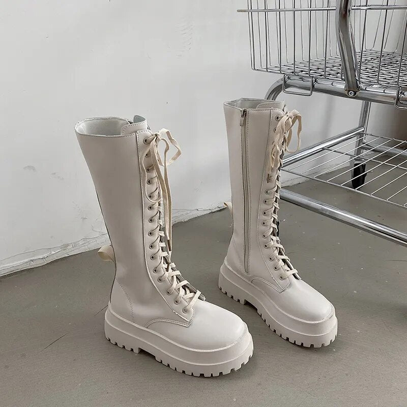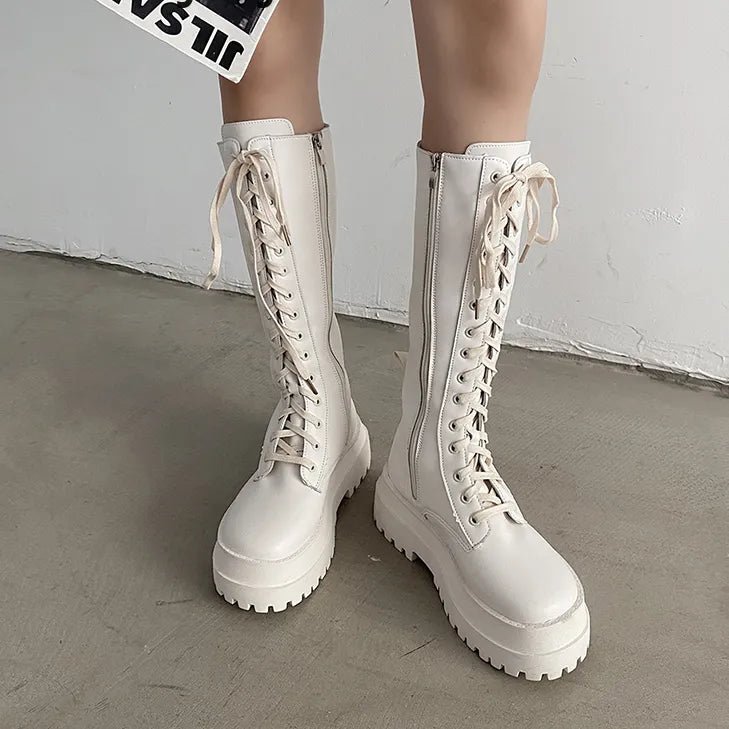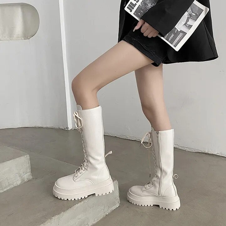 Yeknu - New Women Motorcycle Knee-high Boots Woman Fashion Thick Sole Platform Flats Heels Zipper Botas Femininas Long Booties