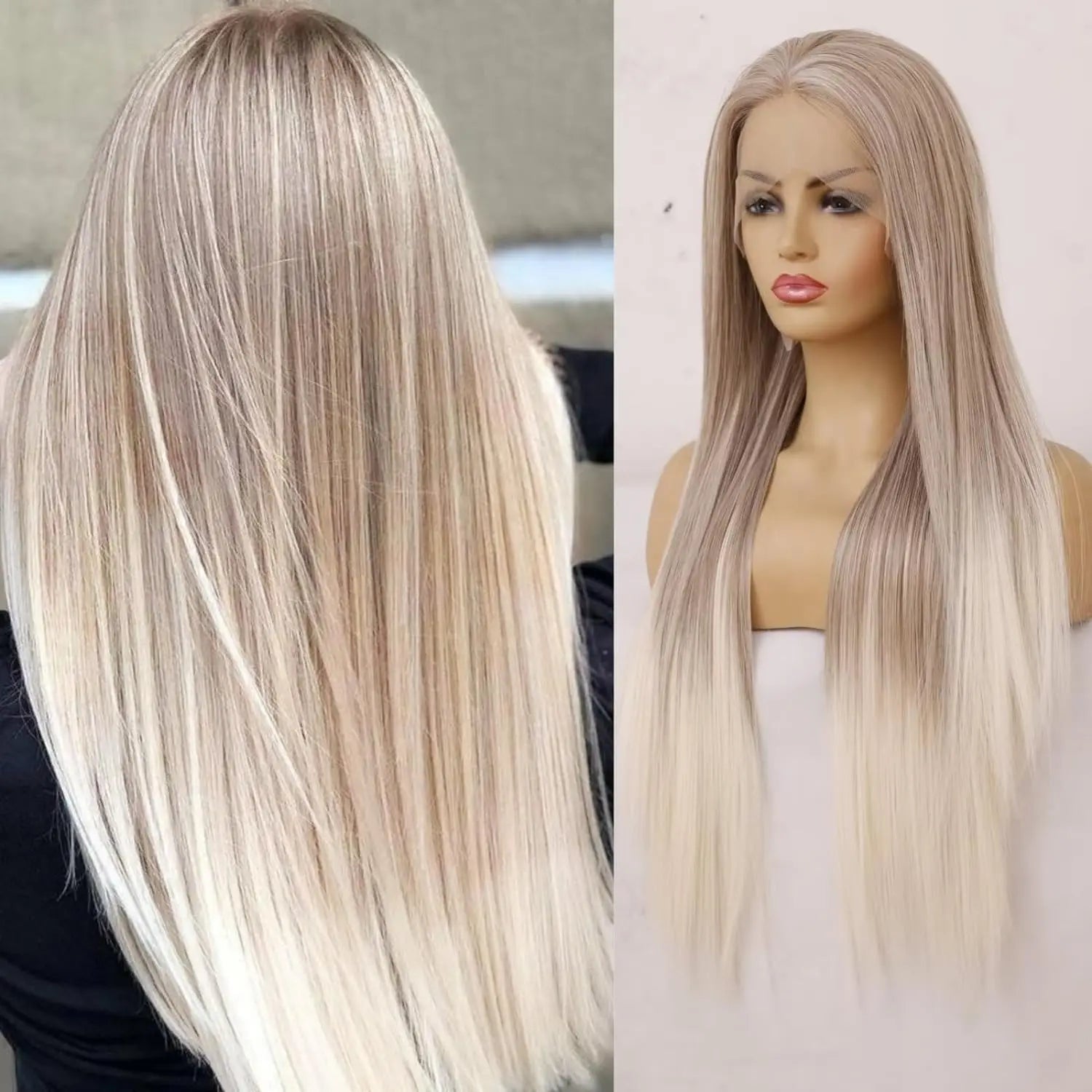 Yeknu Ombre Wig Blonde Synthetic Lace Front Wig Long Straight Glueless Natural Hairline Highlight Hair Frontal Wigs for Women