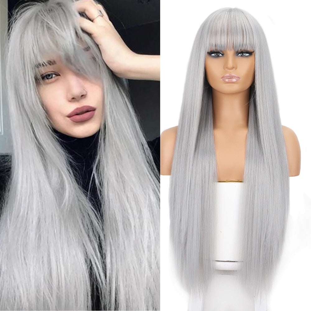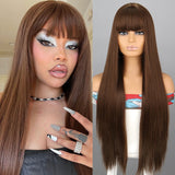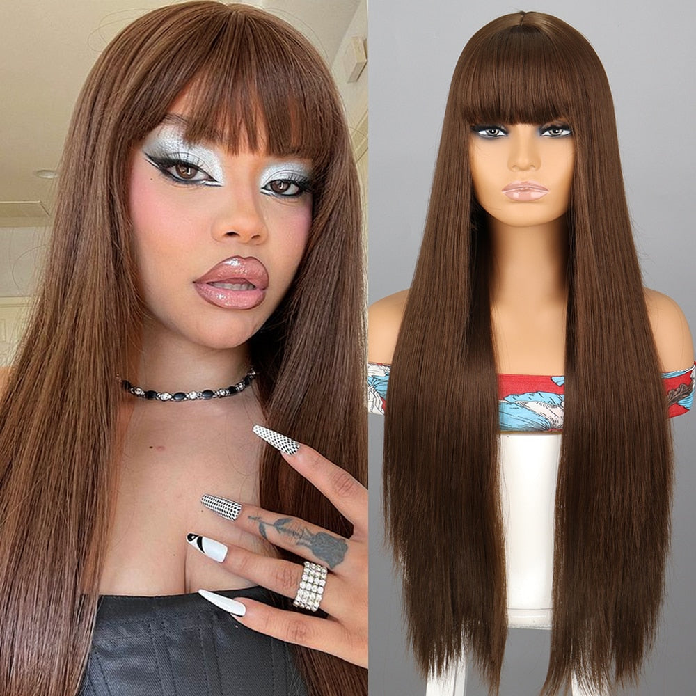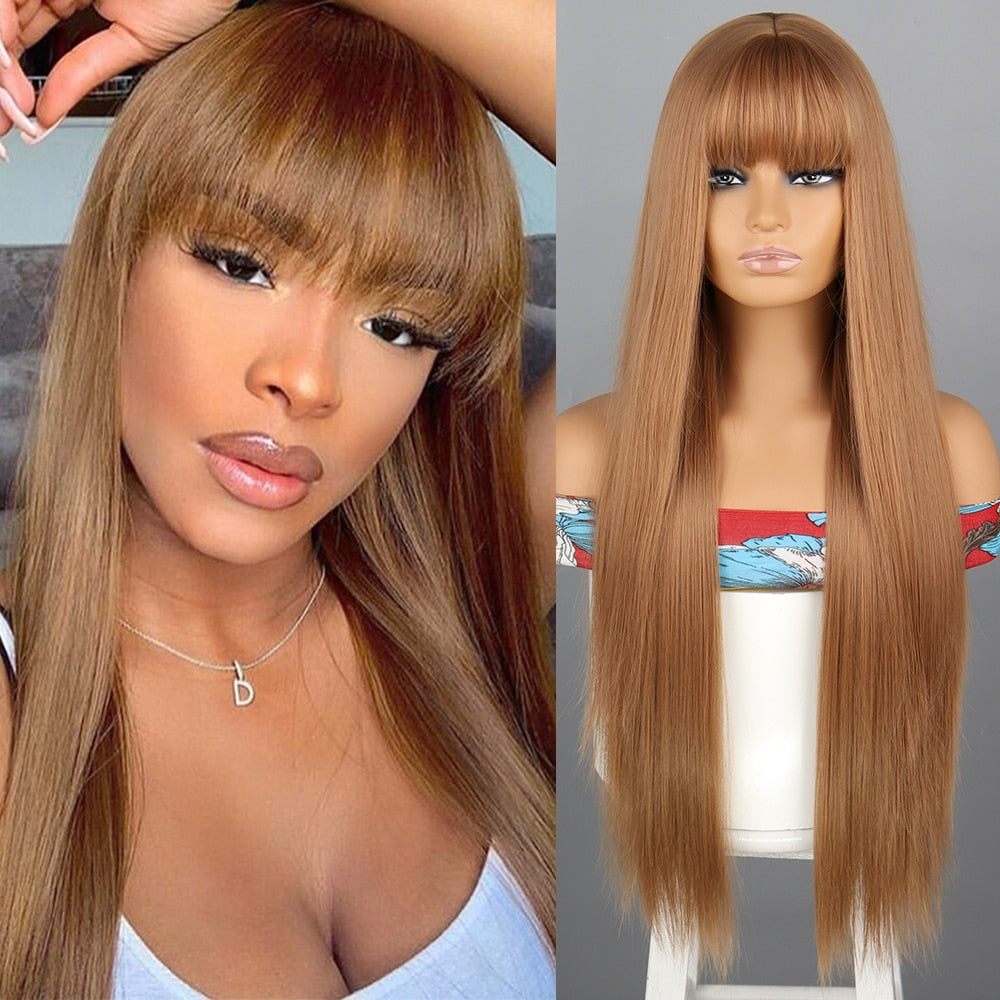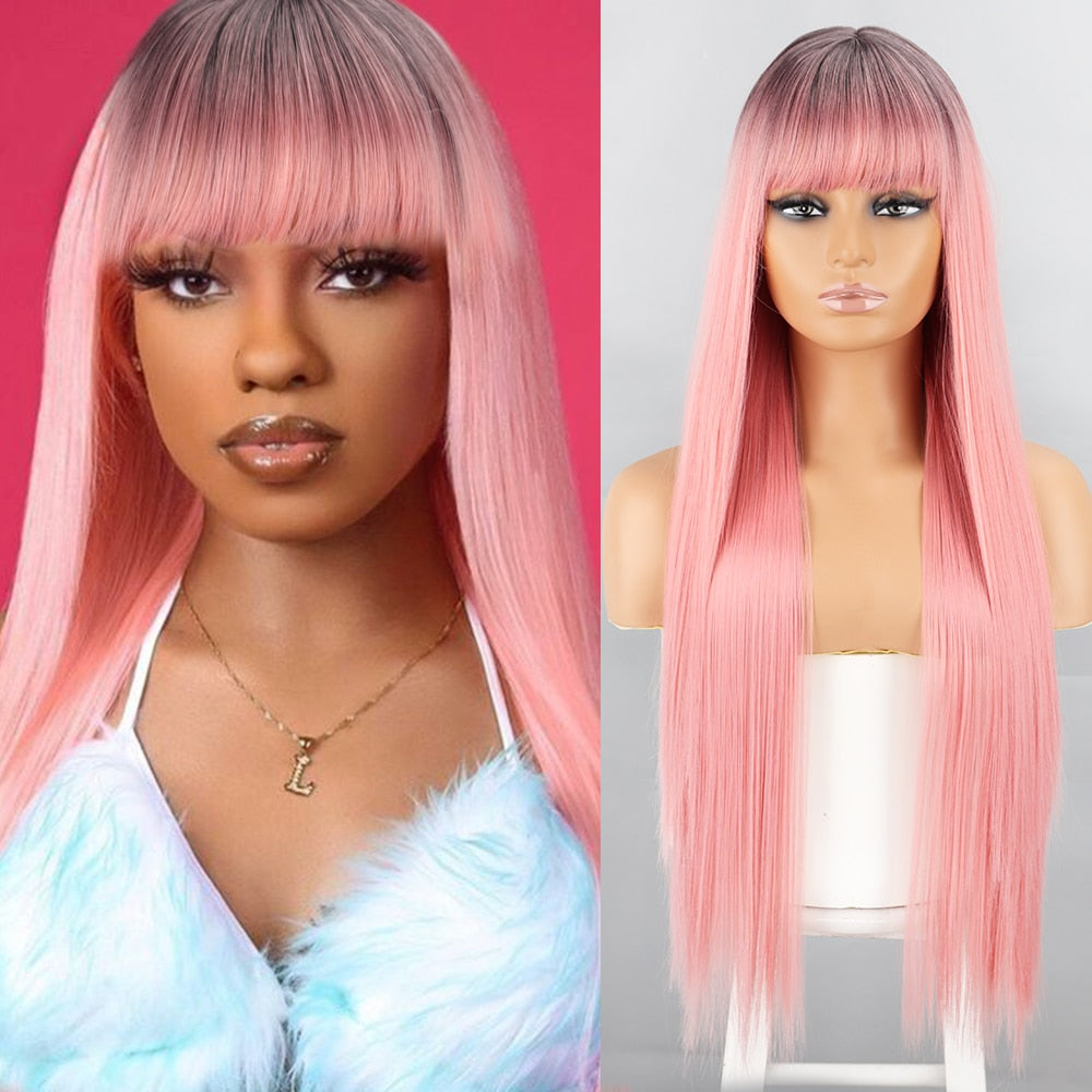 Yeknu Orange Synthetic Wigs Long Straight Wigs With Bangs For Women Pink Red Cosplay Party Daily Use Natural Hair