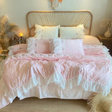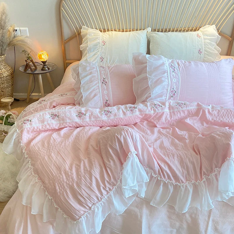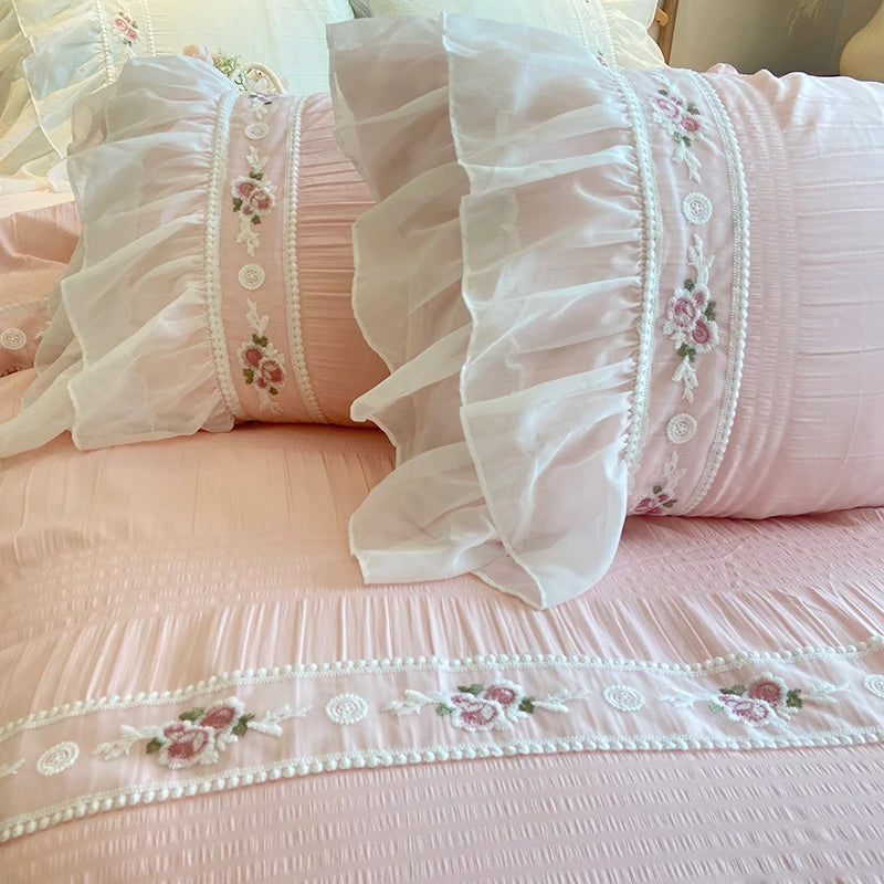 Yeknu Pink Korean Princess Style Lace Ruffles Wedding Bedding Set Seersucker Washed Cotton Soft Duvet Cover Set Bed Sheet Pillowcases