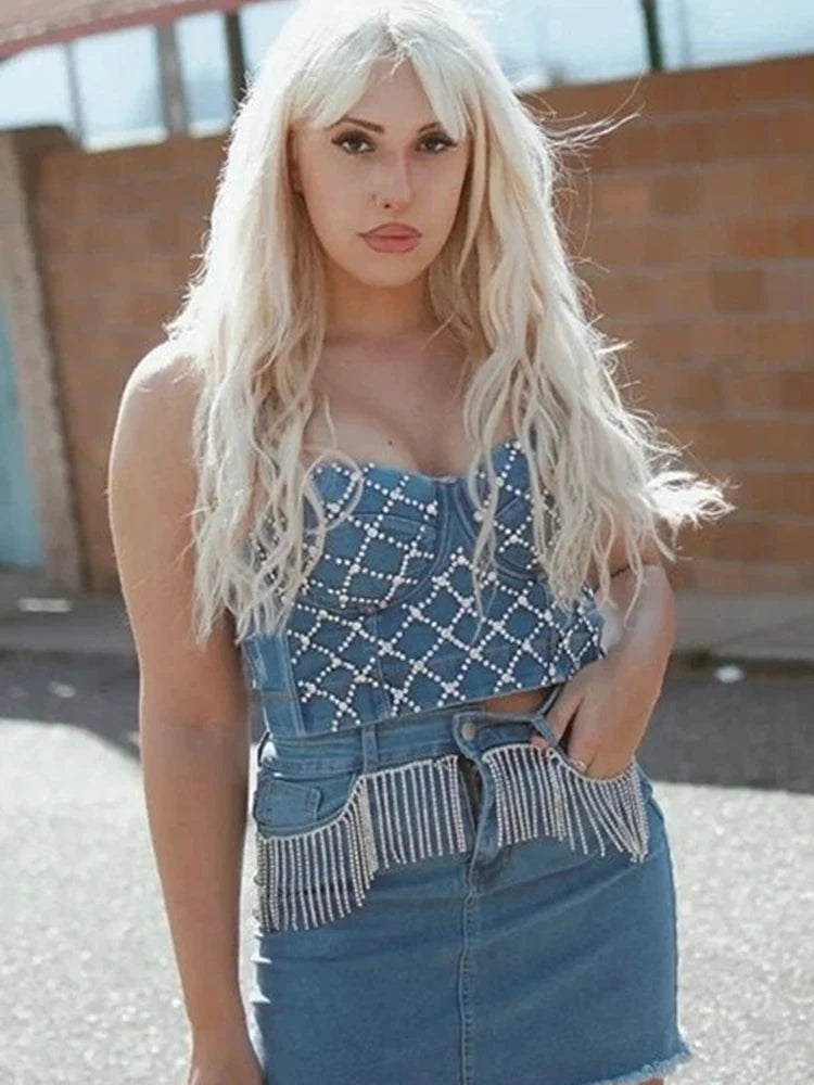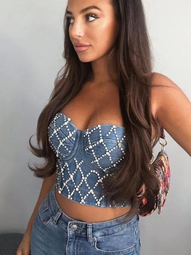 Yeknu Rhinestone Elastic Denim Corset Tops Women Summer Sleeveless Body Shaping Crop Cami Tops Blue Denim Sparkly Bustiers Tee