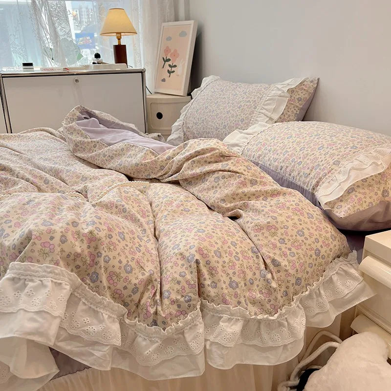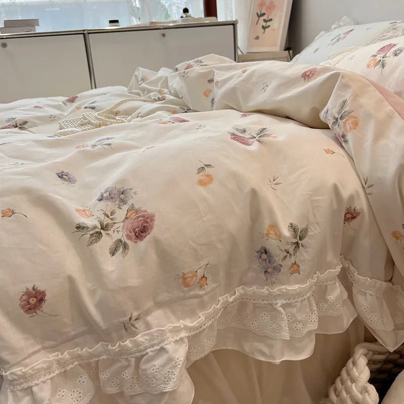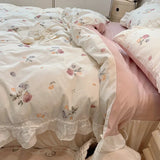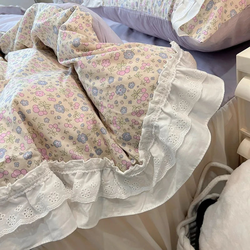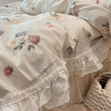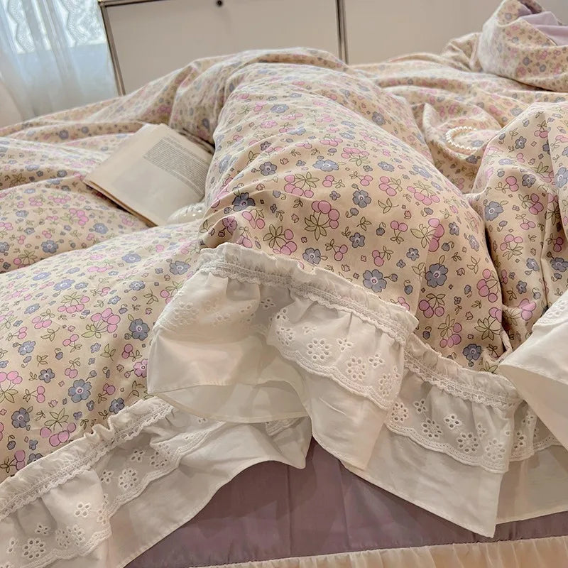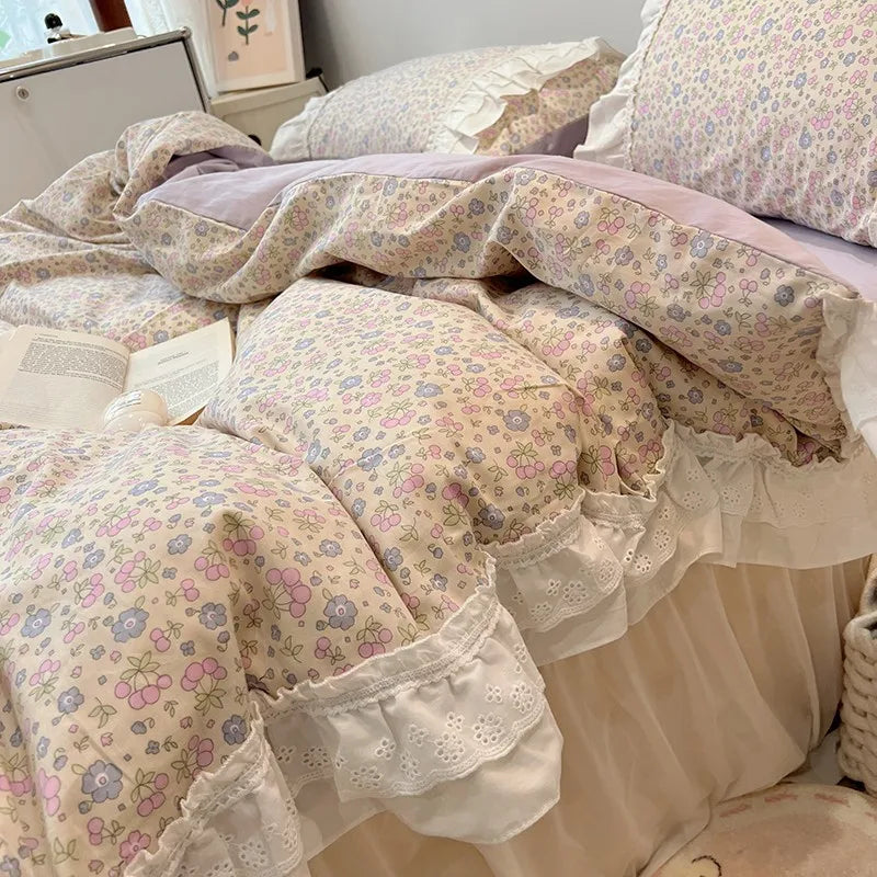 Yeknu Romantic 100%Cotton Twin Bedding Elegant Pink Purple Floral Duvet Cover Set White Lace Ruffle 1.2/1.5/1.8m Bedskirt Pillowcases