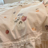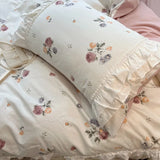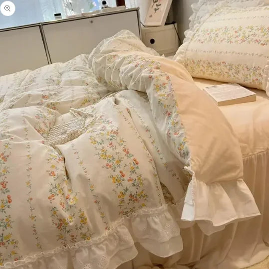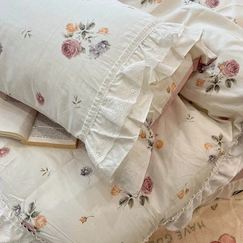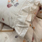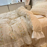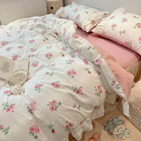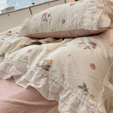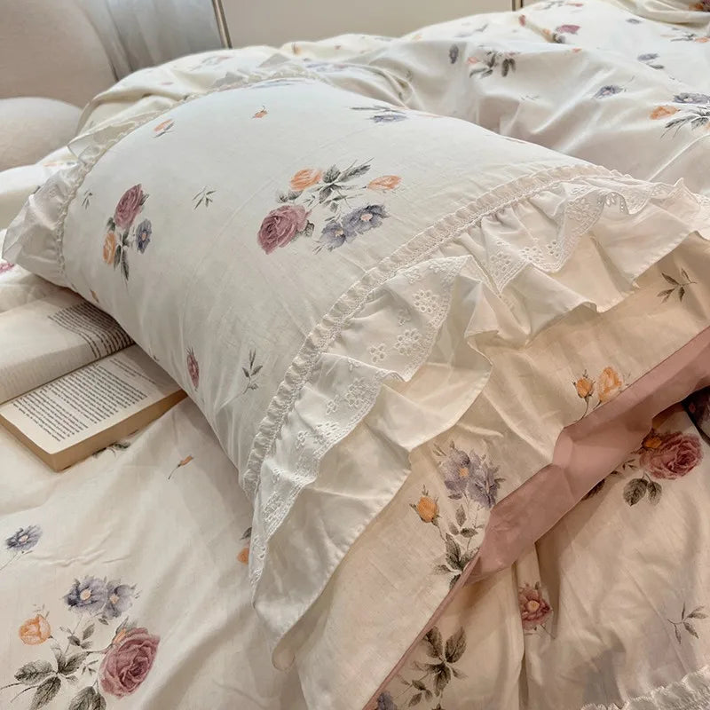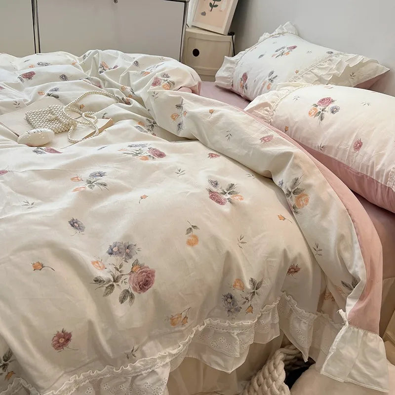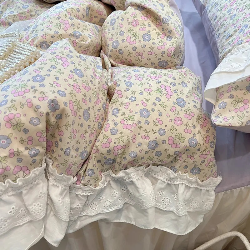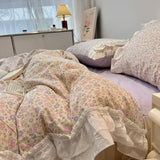 Yeknu Romantic 100%Cotton Twin Bedding Elegant Pink Purple Floral Duvet Cover Set White Lace Ruffle 1.2/1.5/1.8m Bedskirt Pillowcases