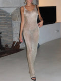 Yeknu Sexy Shiny And Shiny Silk Backless Suspender Dress Women Elegant V Neck See Trough Maxi Robes Spring Summer Ladies Beach Dresses