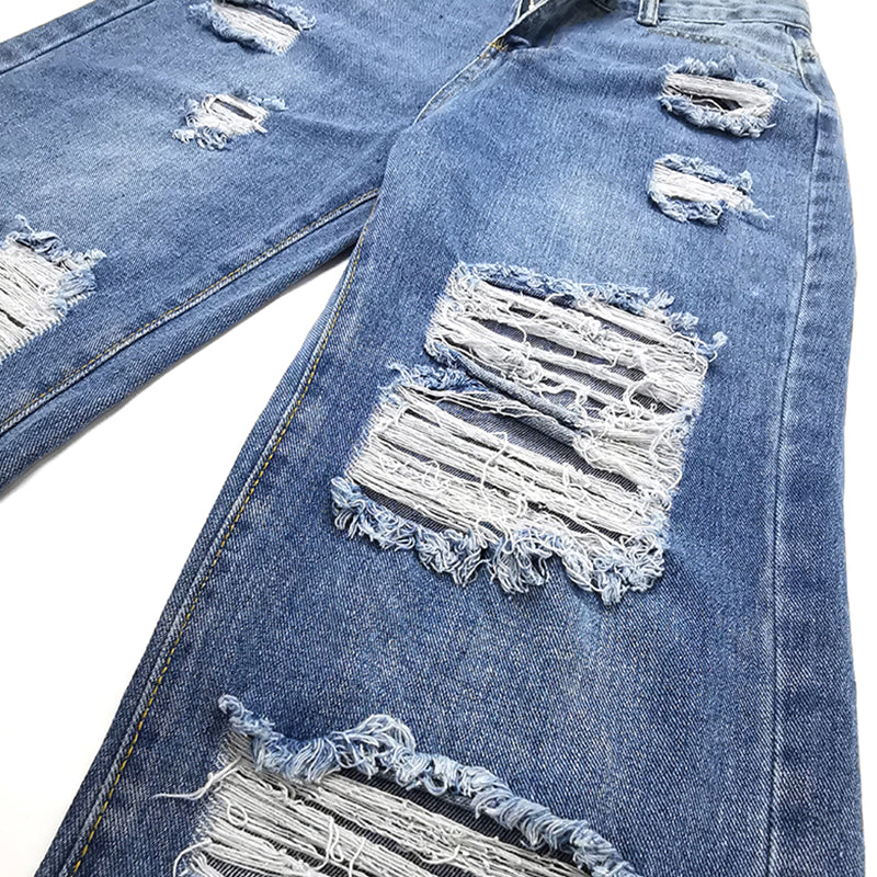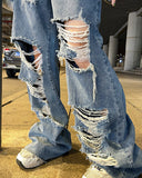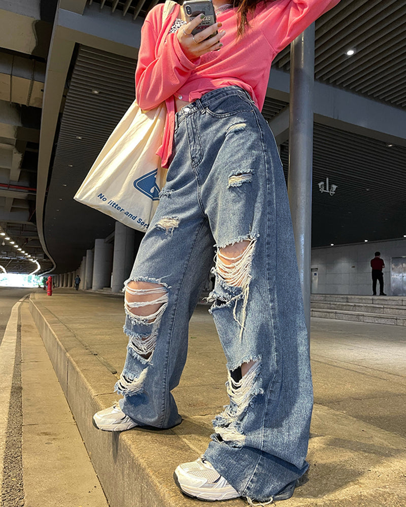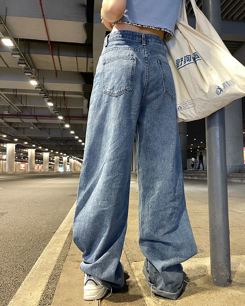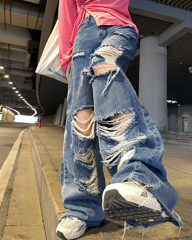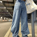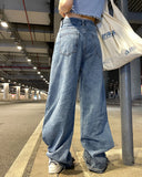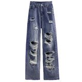 Yeknu Spring and Autumn Women's street jeans Ripped jeans High waisted baggy jeans Wide leg jeans Y2K hip hop pants Blue fashion jeans