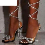 Yeknu Summer New Strappy Thigh High Sandals Sexy Over The Knee High Heels Women Shoes Fashion Crystal Bow Party Pumps Lady Slides