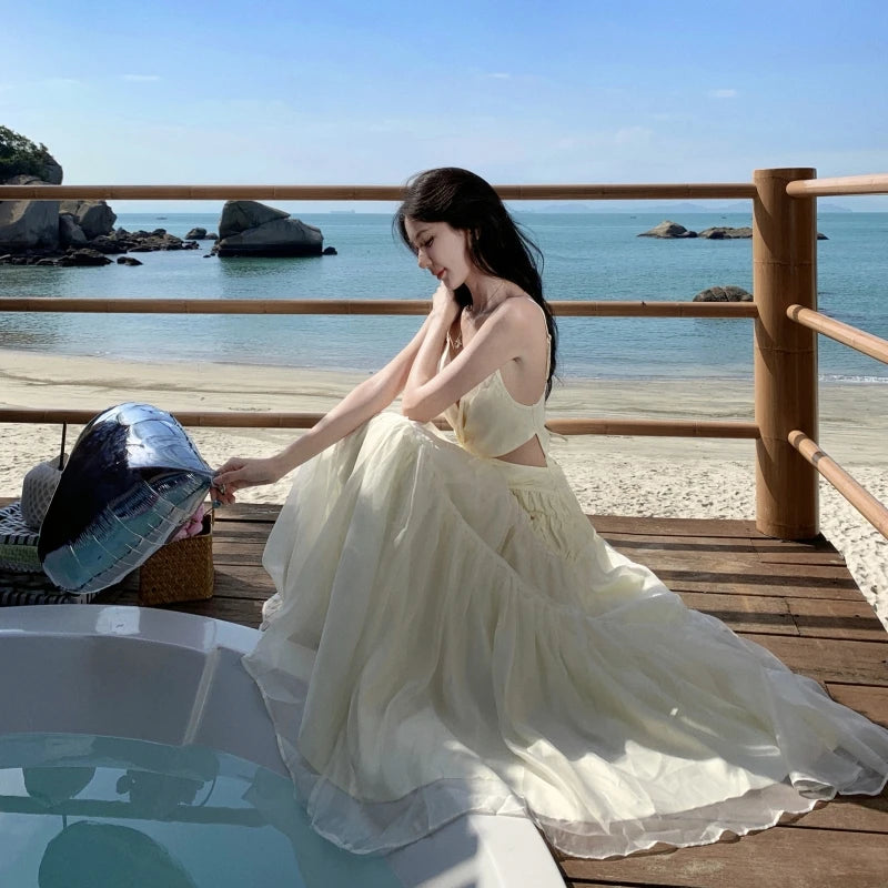 Yeknu Summer Sexy Backless Long Dresses for Women 2024 Elegant Party Fashions Sleeveless Lace-up Female Clothing Beach Chiffon Boho