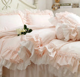 Yeknu Super Sweet Solid Color Bedding Sets Luxury Princess Wedding Pink Lace Ruffle Cotton Duvet Cover Bedspread Bed Skirt Pillowcases