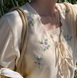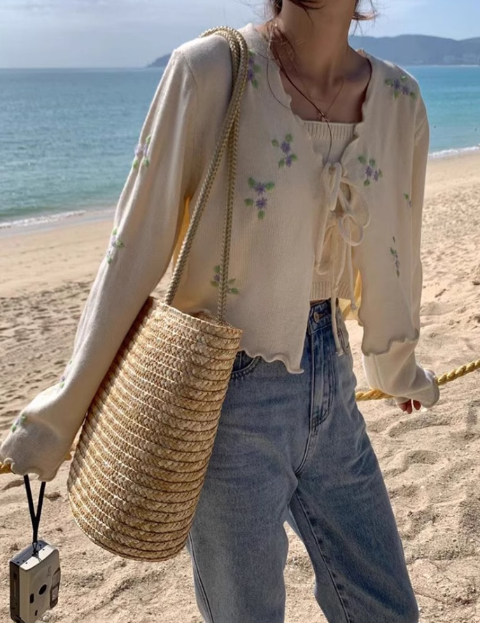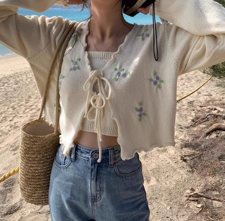Yeknu Vintage Embroidery Knitted Two Piece Women Sets Autumn Long Sleeve Cropped Cardigan+Ribbed Knit Short Vest Casual Sweater Outfit