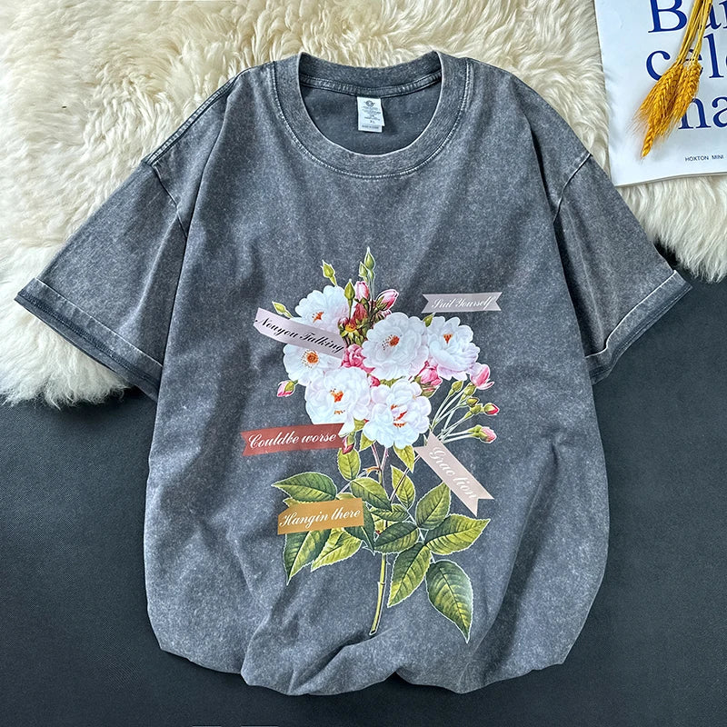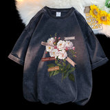 Yeknu Vintage Flowers Graphic Print T-shirt Gothic Men Tshirts Washed Short Sleeved Man Tops Round Neck General Tee