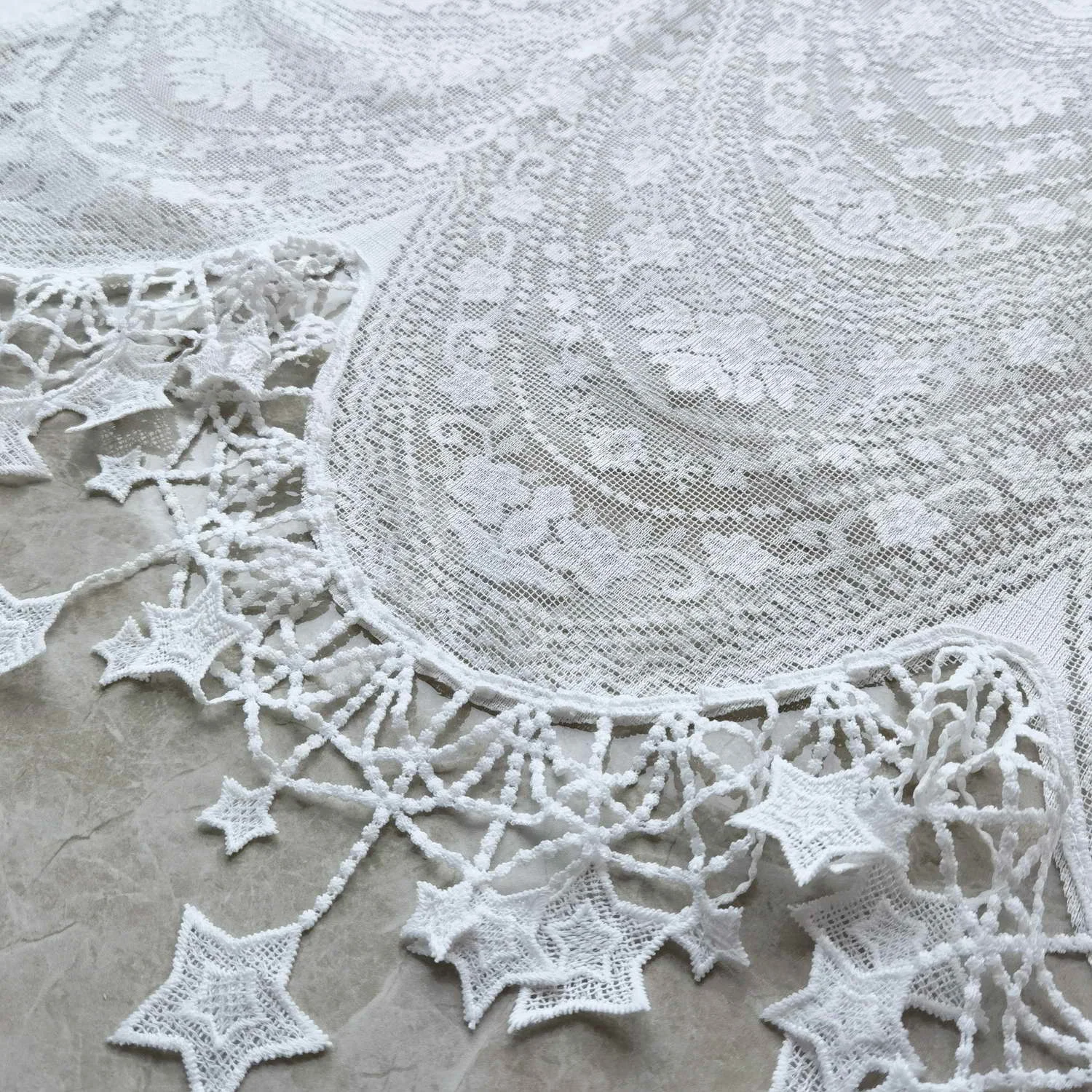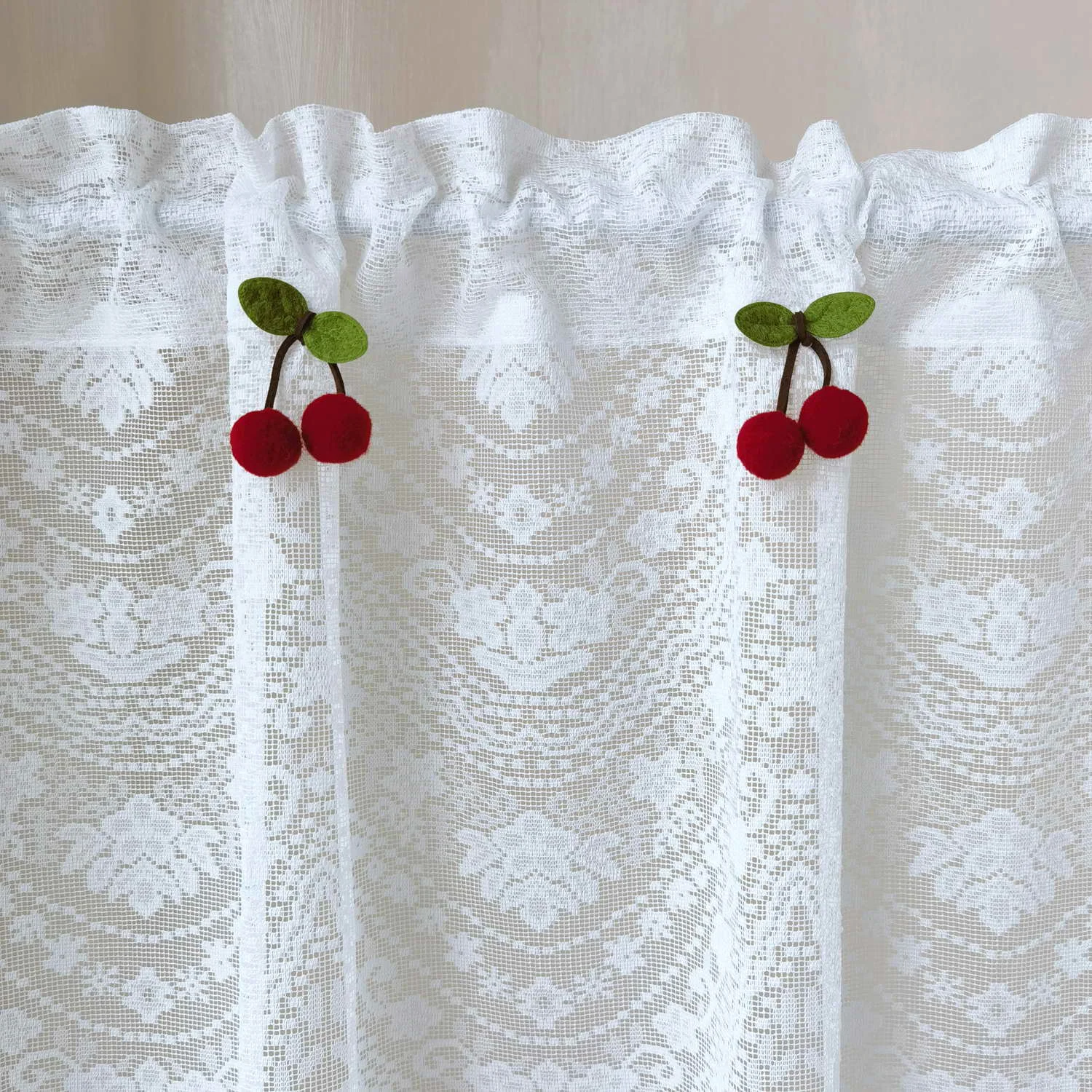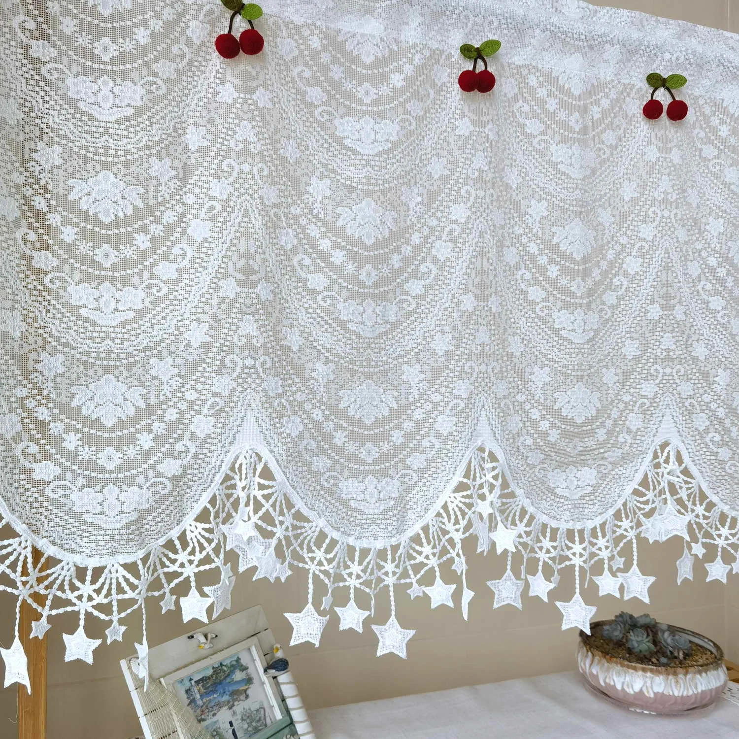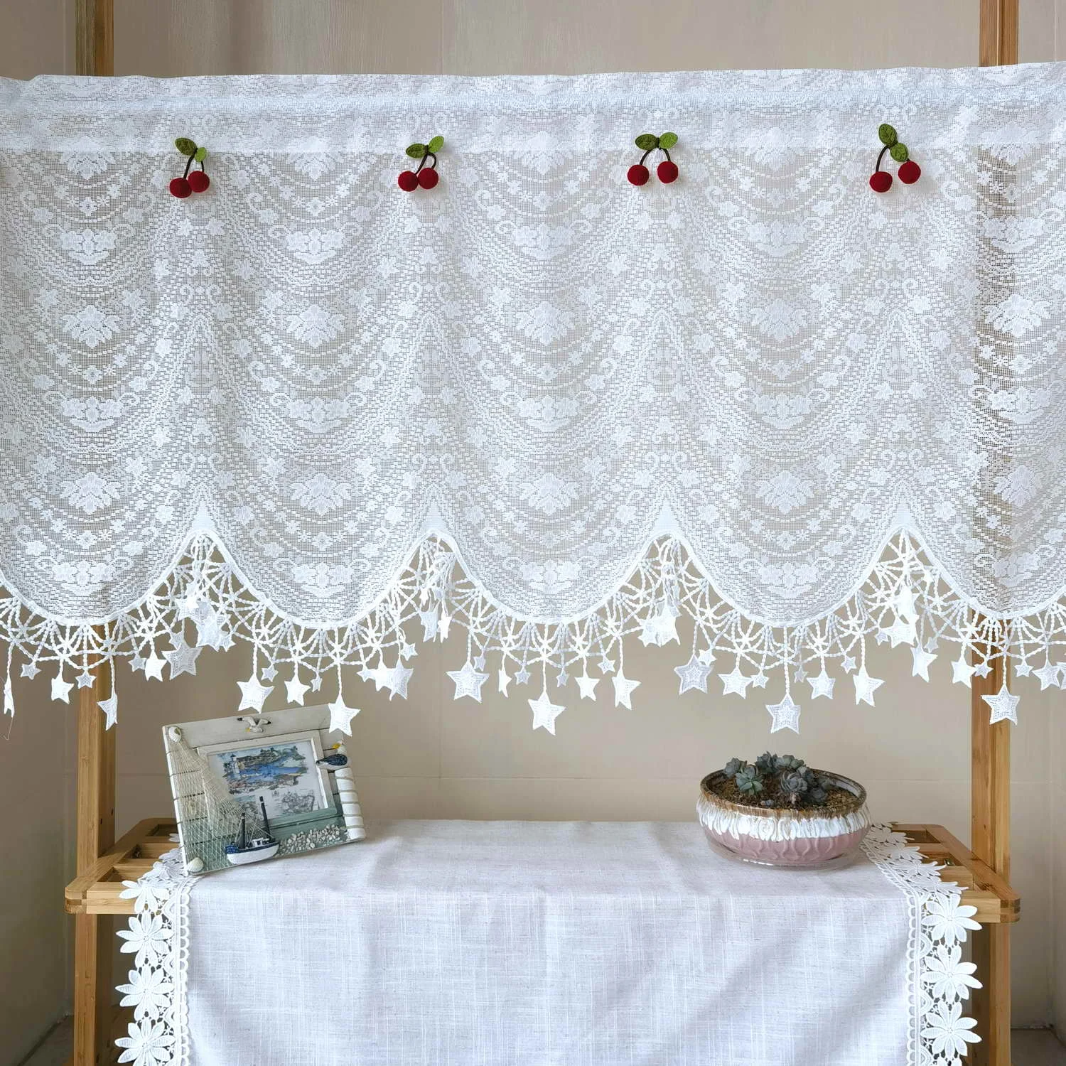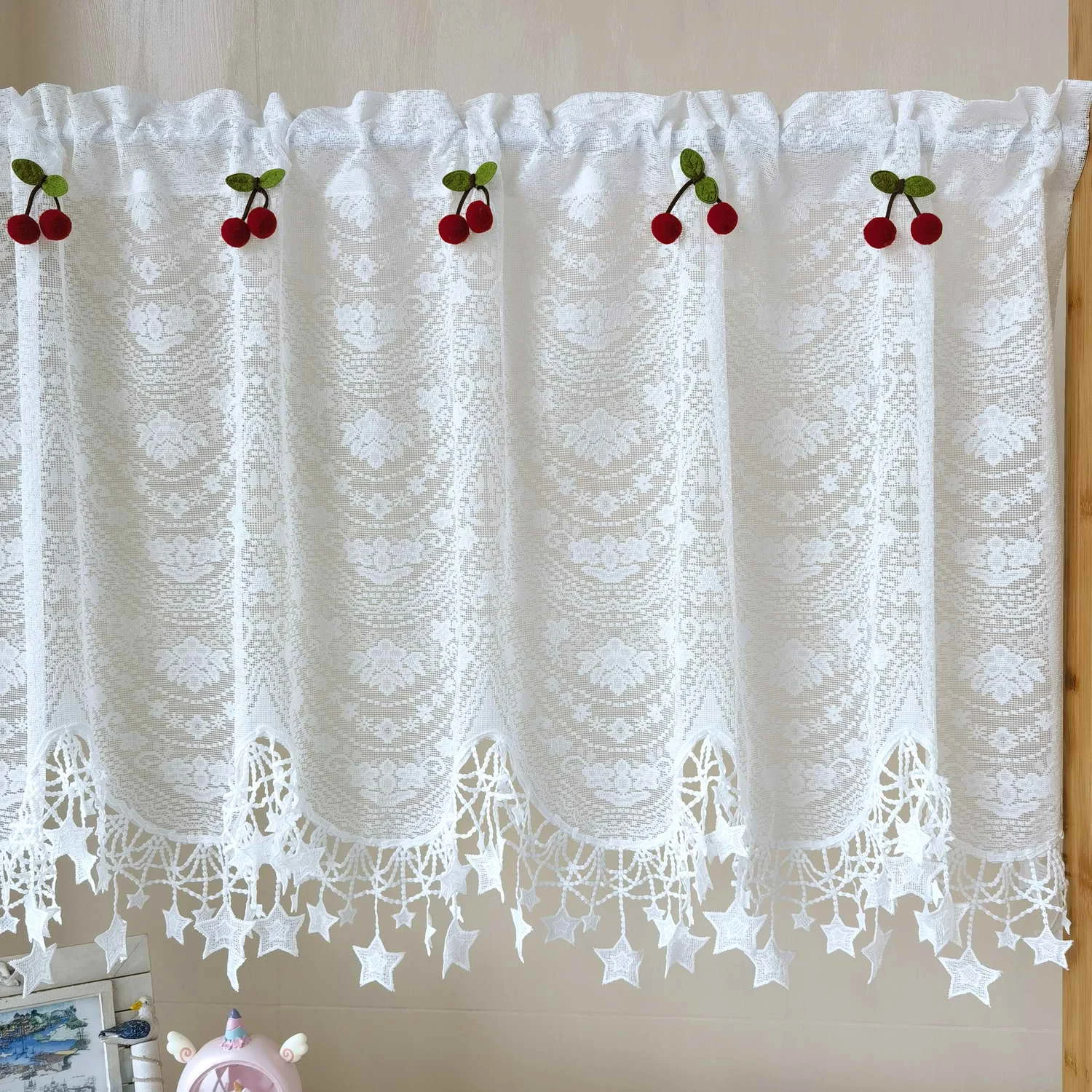 Yeknu White Lace Embroidery Tulle Kitchen Curtain Cherry Pentagram Wavy Short Curtain Cute Coffee Half Window Curtain