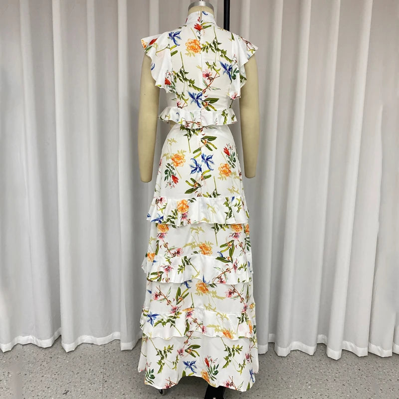 Yeknu Women Maxi Dresses Summer Fashion Floral Printed Flying Sleeve Stand Neck Lace Up Hollow Ruffled Layered Party Dress