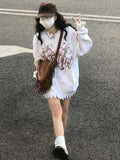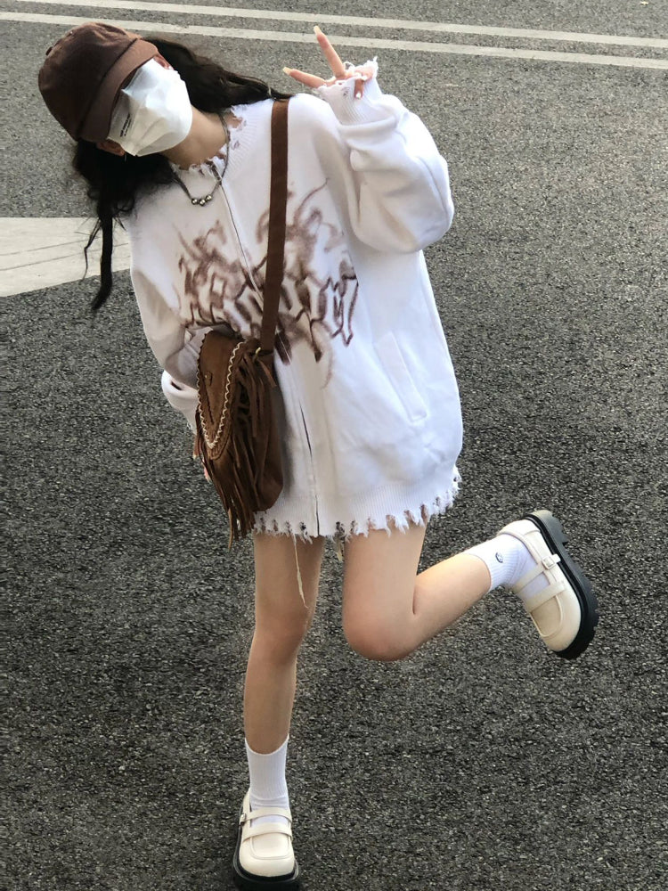 Yeknu Y2k Cardigan Women Ripped Oversized Jumper Vintage Tie Dye Letter Knitted Zipper Sweater Jackets Harajuku Streetwear