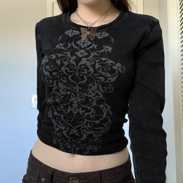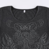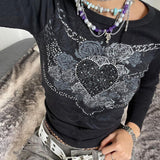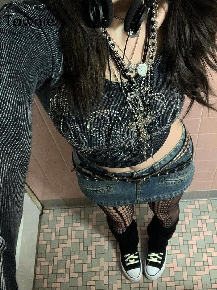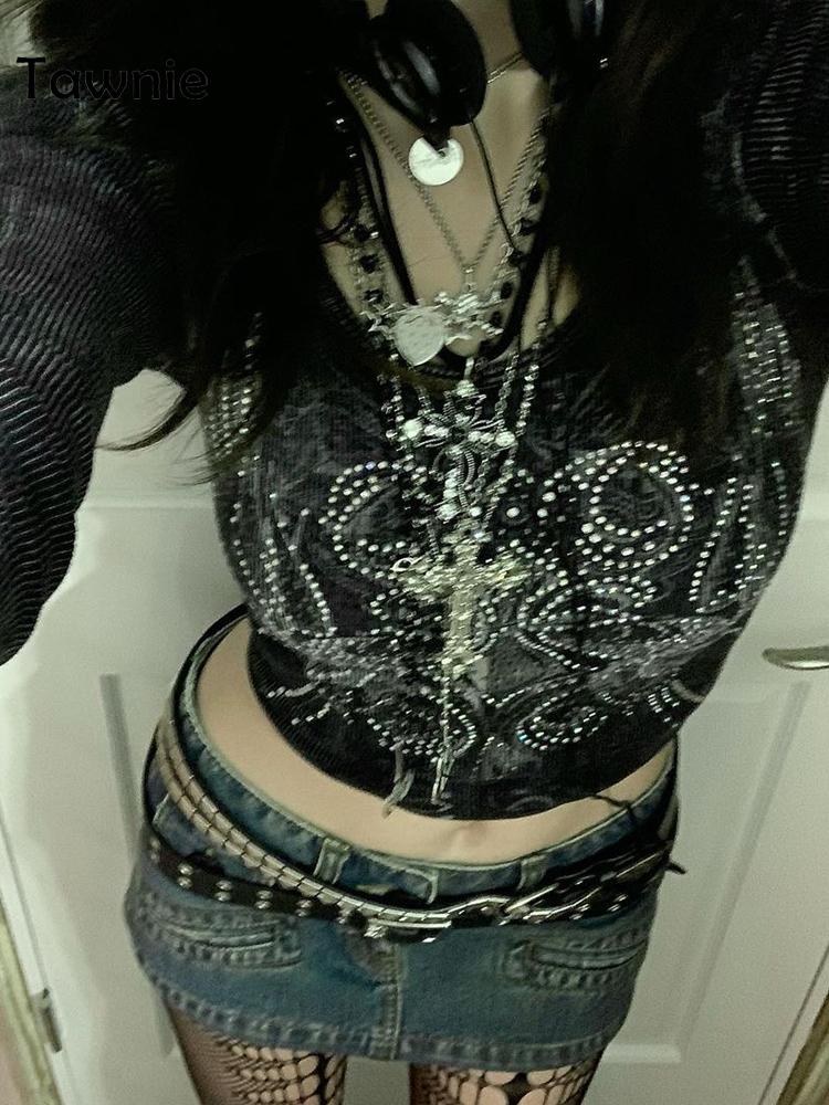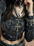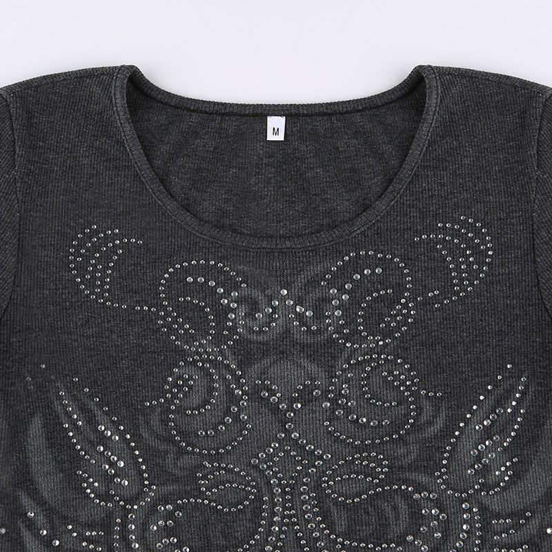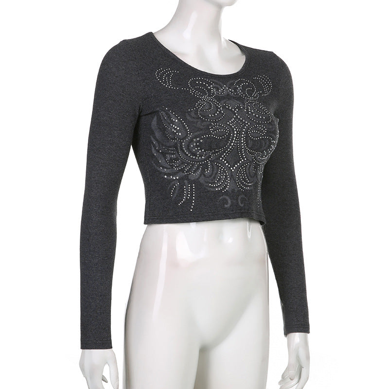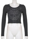 Yeknu Y2K Graphic Rhinestone Print Women T Shirt Spring Grunge Aesthetic Fairycore Crop Tops O Neck Long Sleeve Tee Top