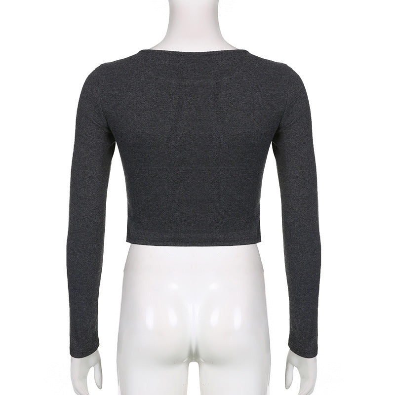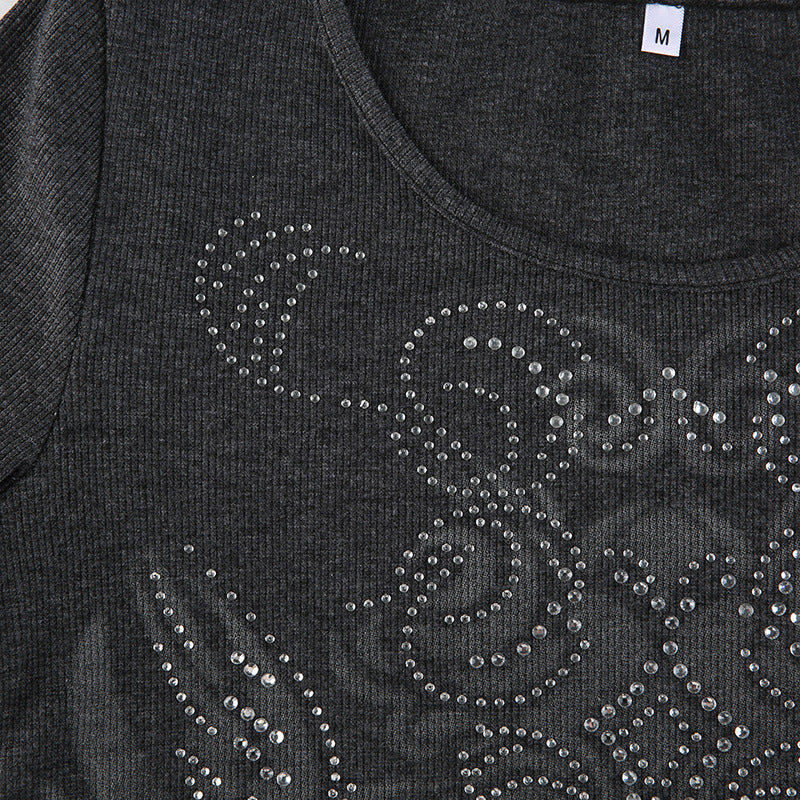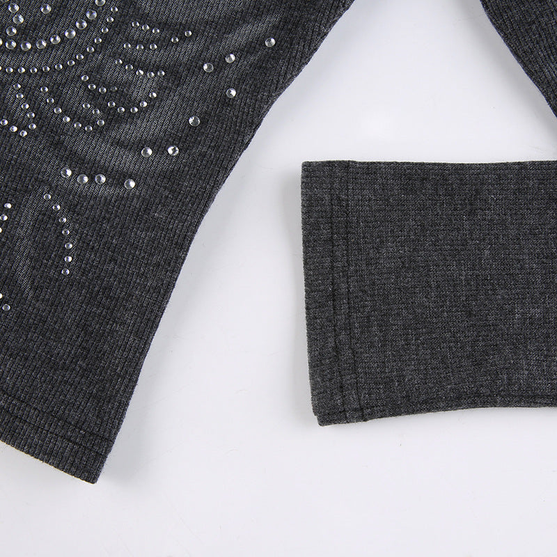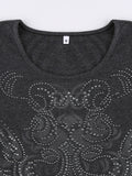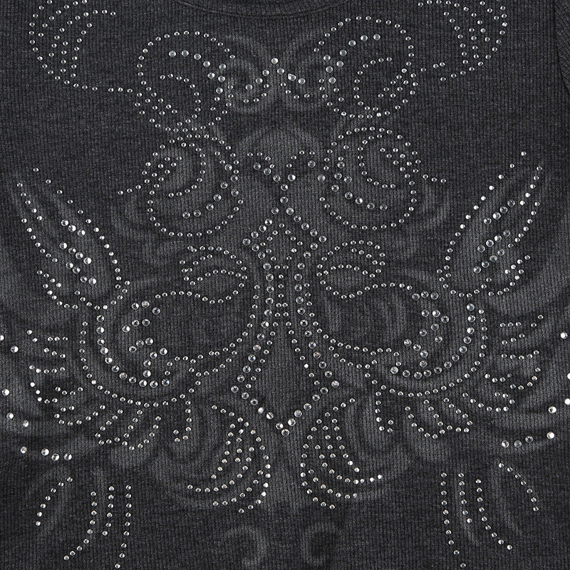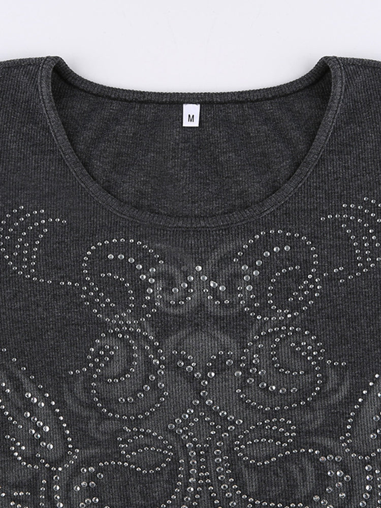 Yeknu Y2K Graphic Rhinestone Print Women T Shirt Spring Grunge Aesthetic Fairycore Crop Tops O Neck Long Sleeve Tee Top