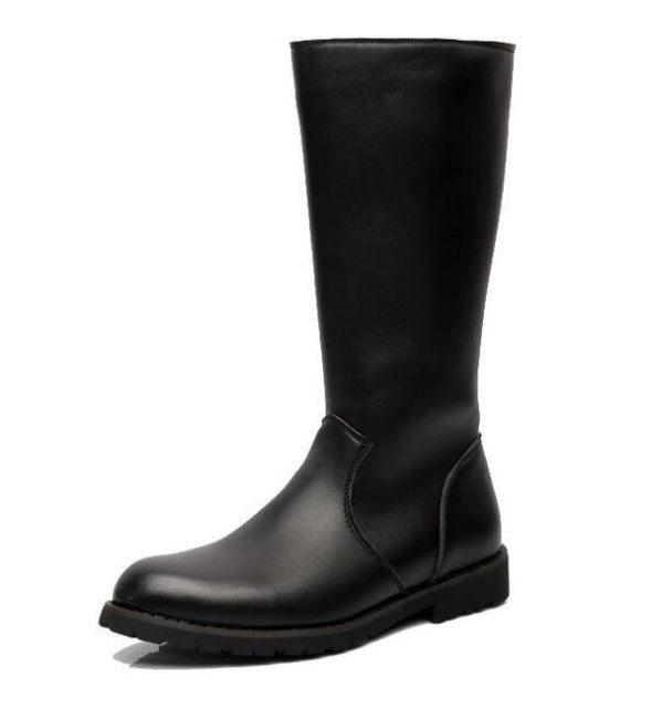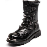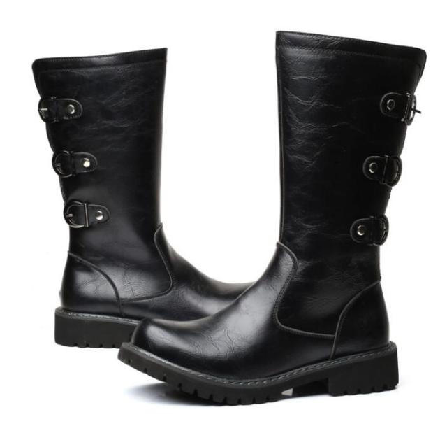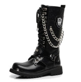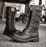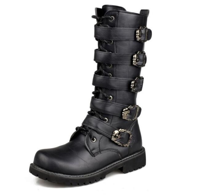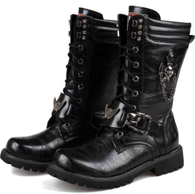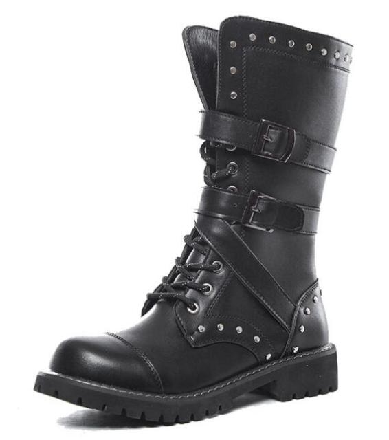 Yeknu Men's Leather Motorcycle Boots Mid-calf Military Combat Boots Gothic Belt Punk Boots Men Shoes Tactical Army Boot